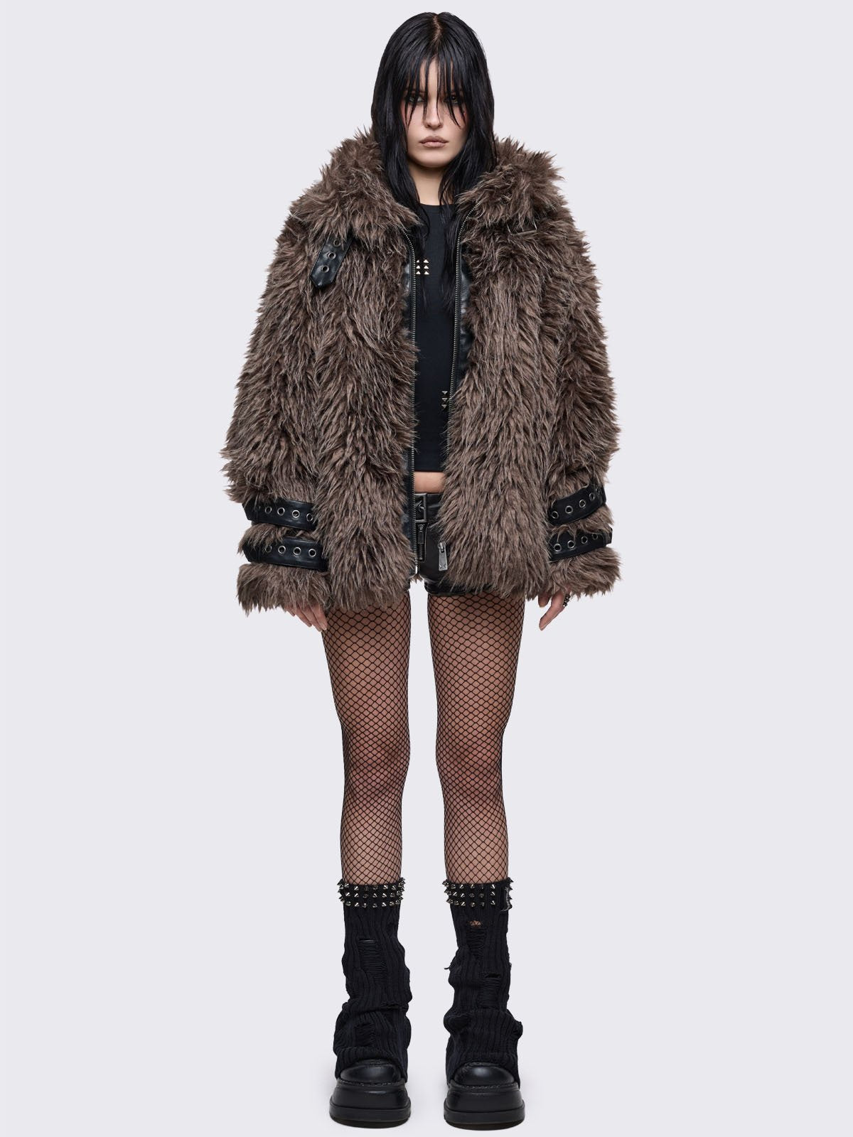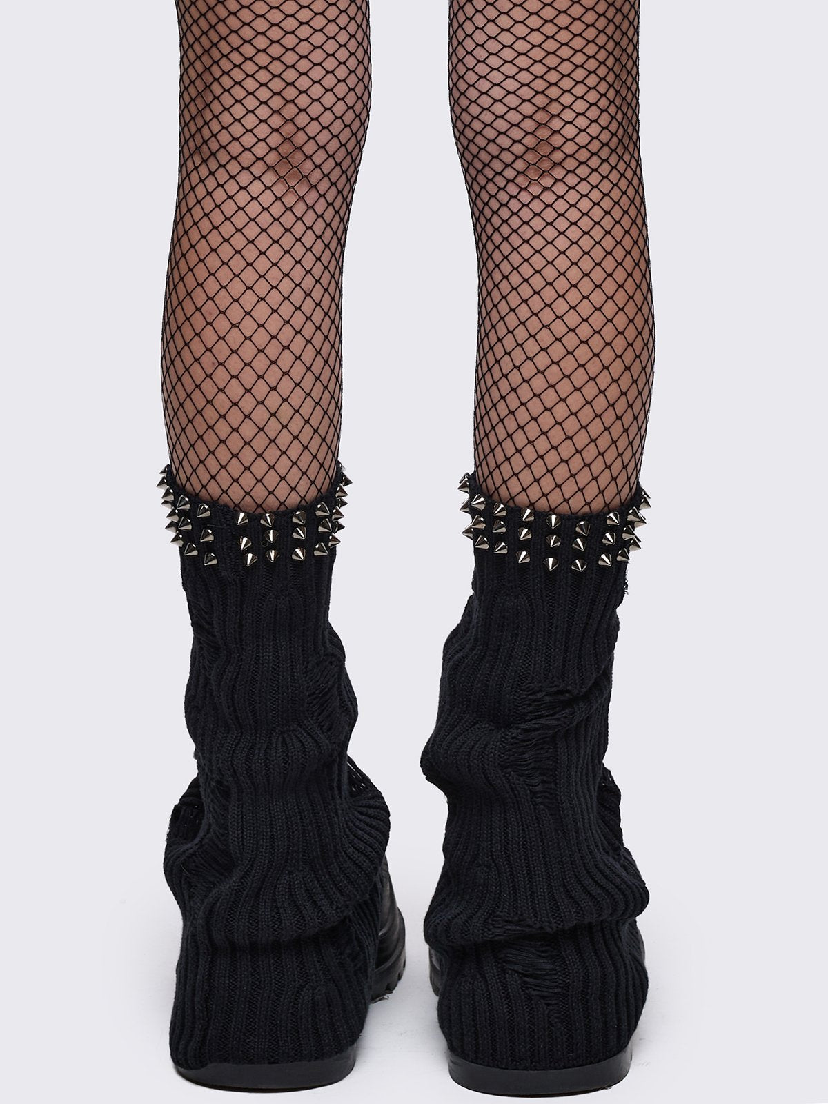 Black knitted flare leg warmers with spiked trim and distressed details.