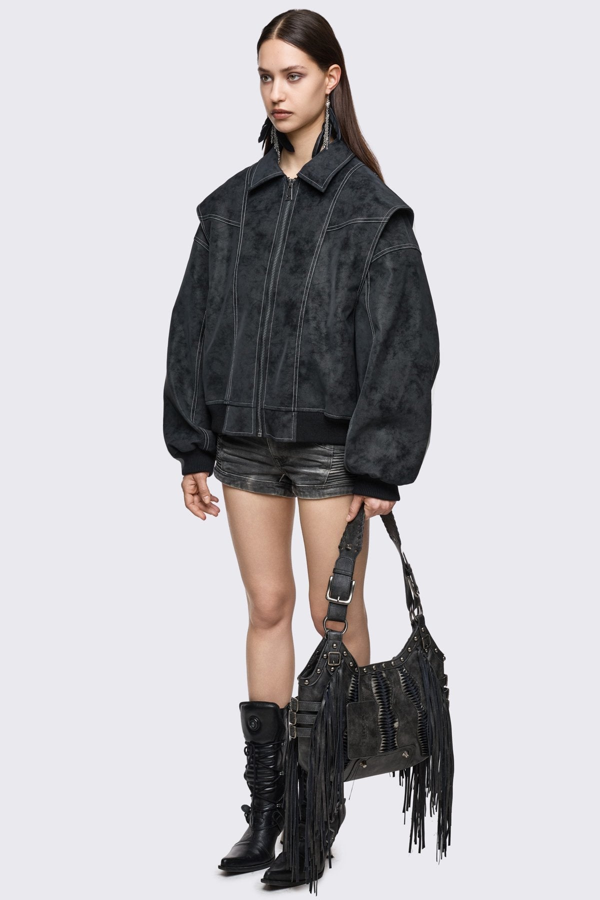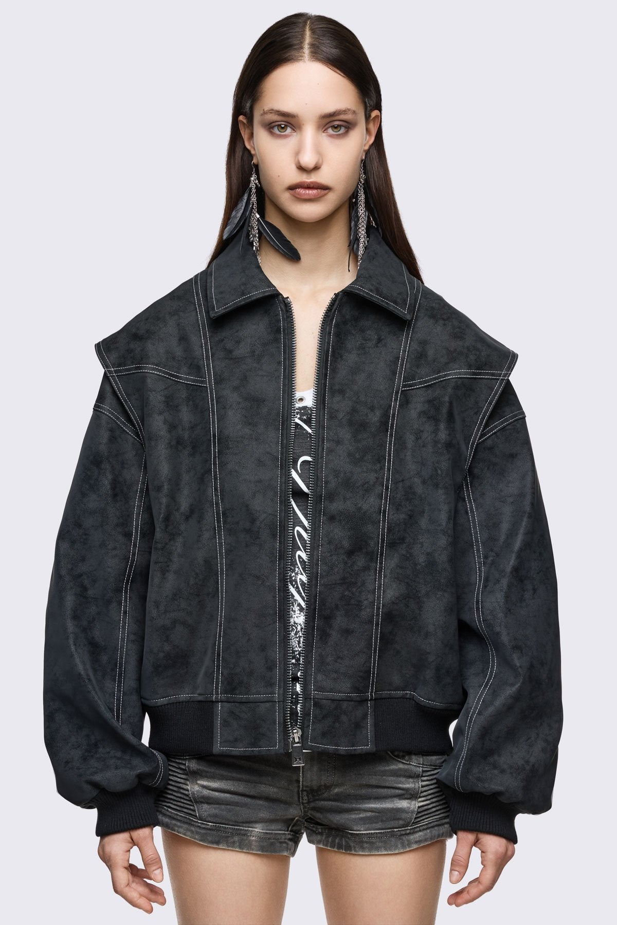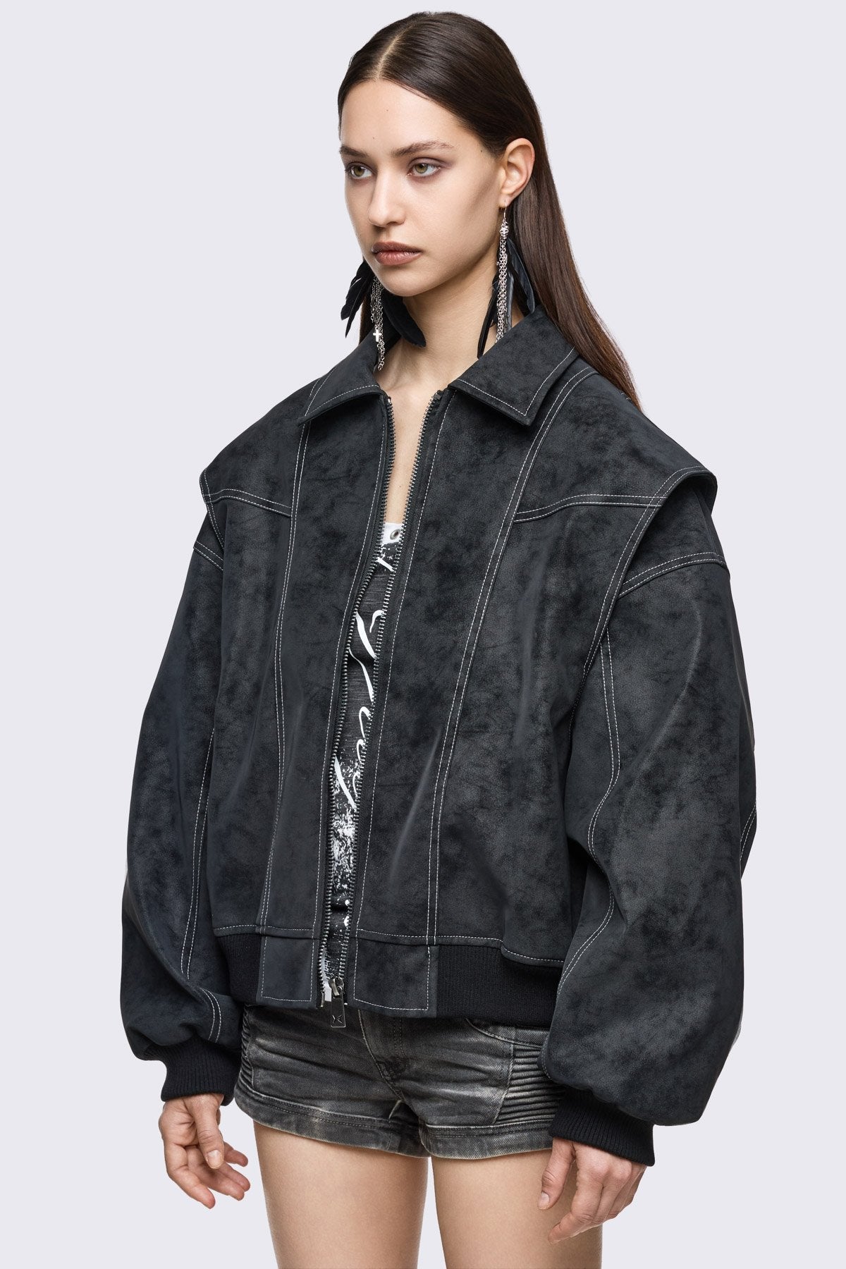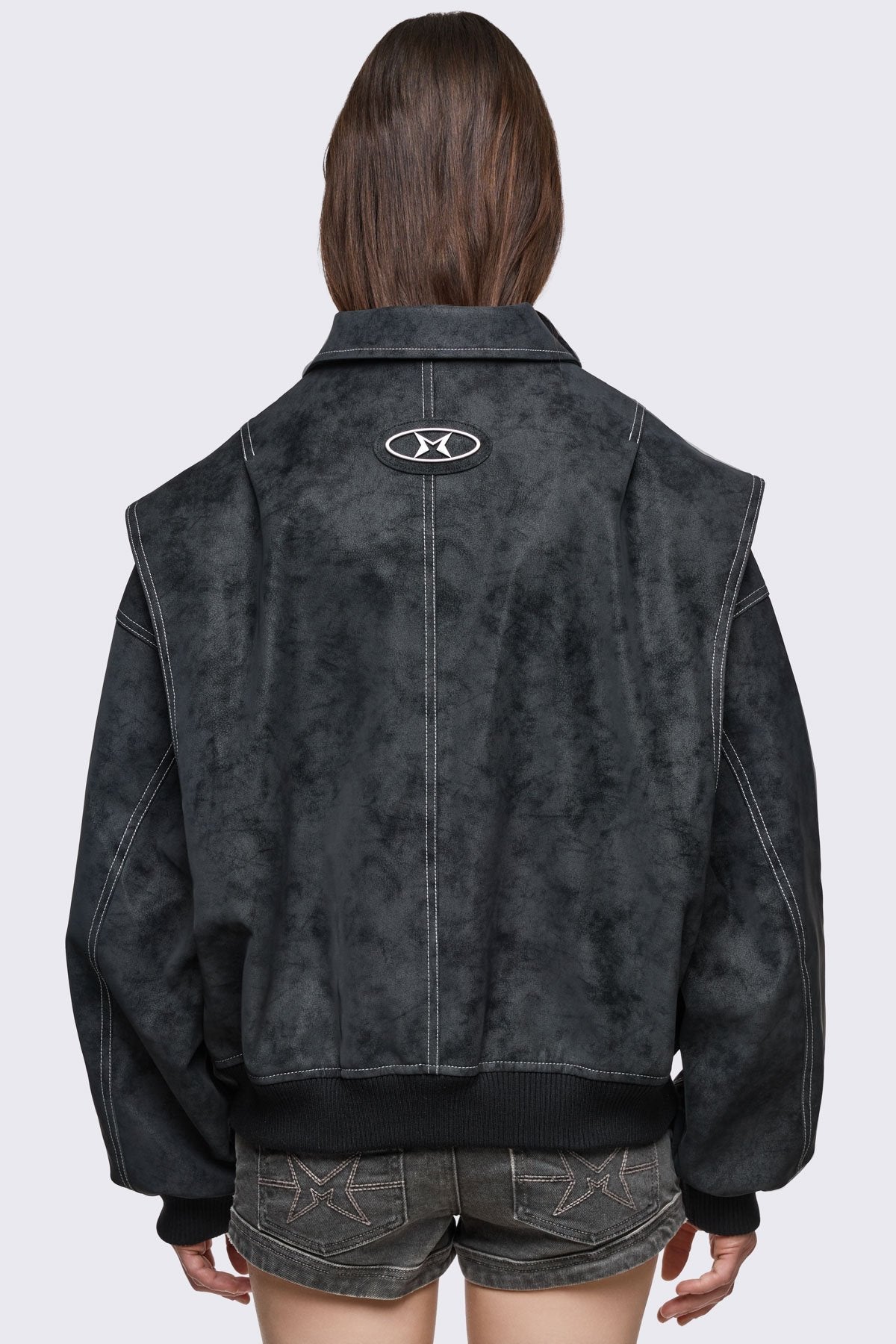 Black faux leather bomber jacket with white contrast stitching, layered sleeves and oversized grunge fit.