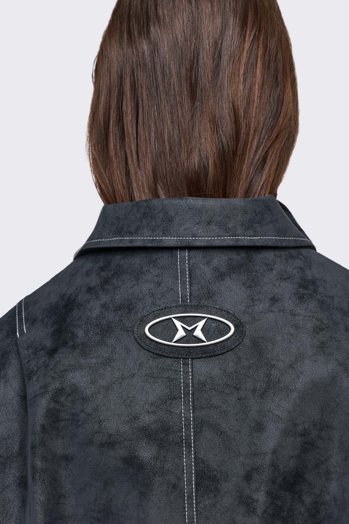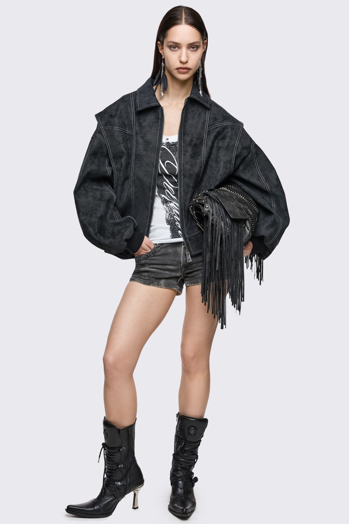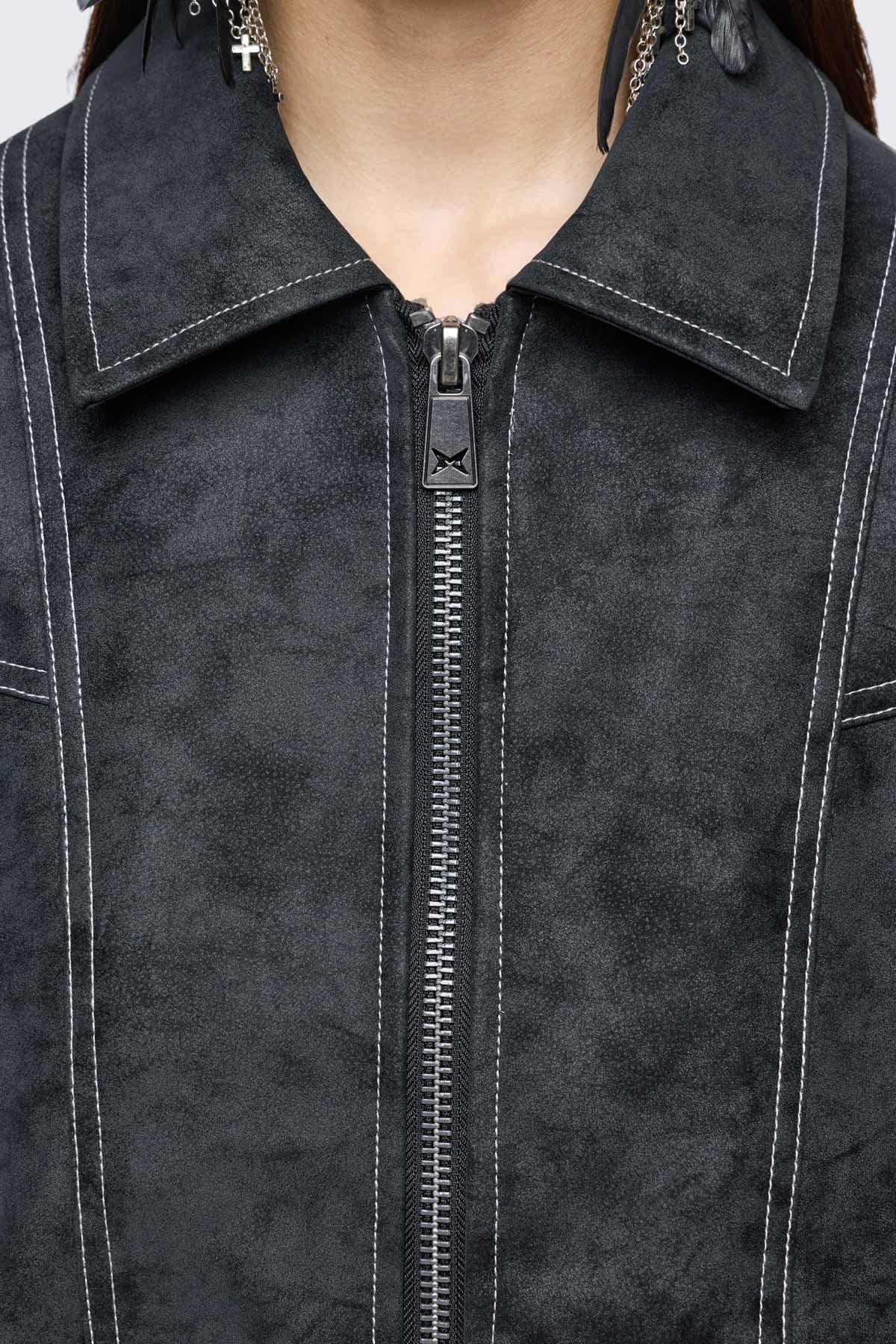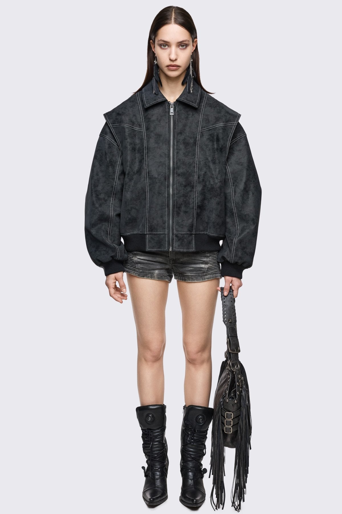 Black faux leather bomber jacket with white contrast stitching, layered sleeves and oversized grunge fit.