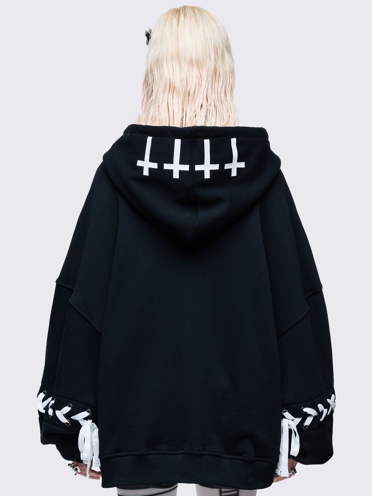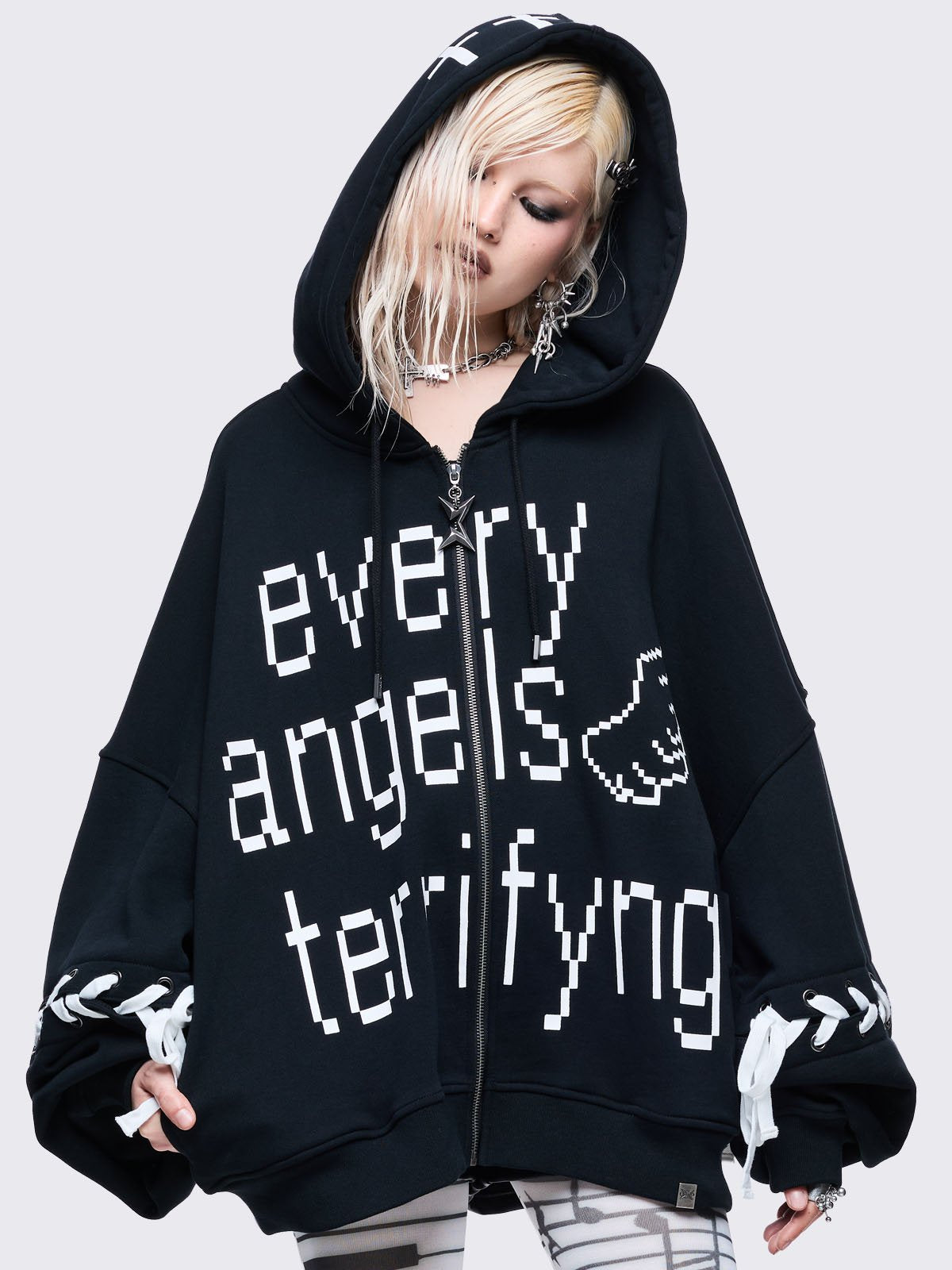 Black zip up hoodie jacket with "Every angels terrifying" graphic print and white lace-up details.
