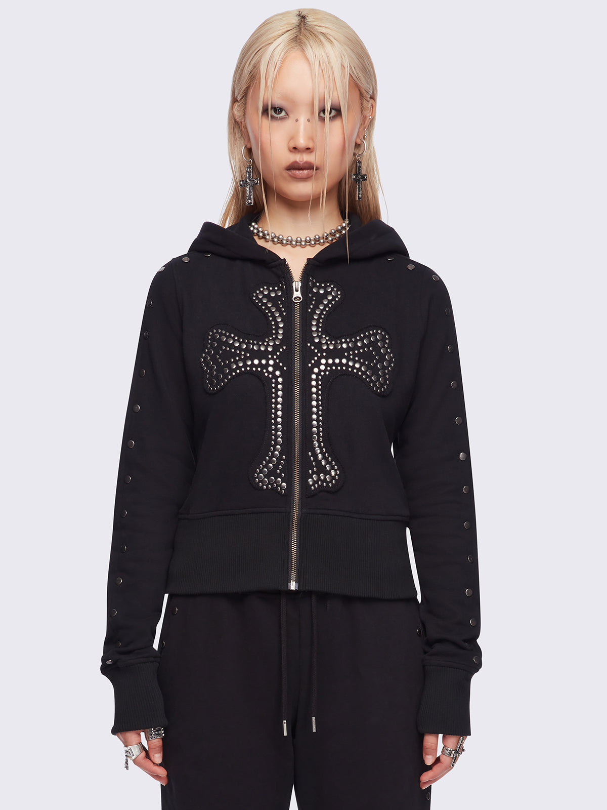 Black layered zip-up hoodie featuring gothic lettering and a cross patch with studded accents, oversized fit, drawstring hood, and zip fastening.