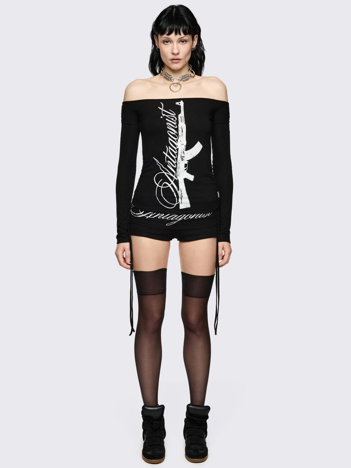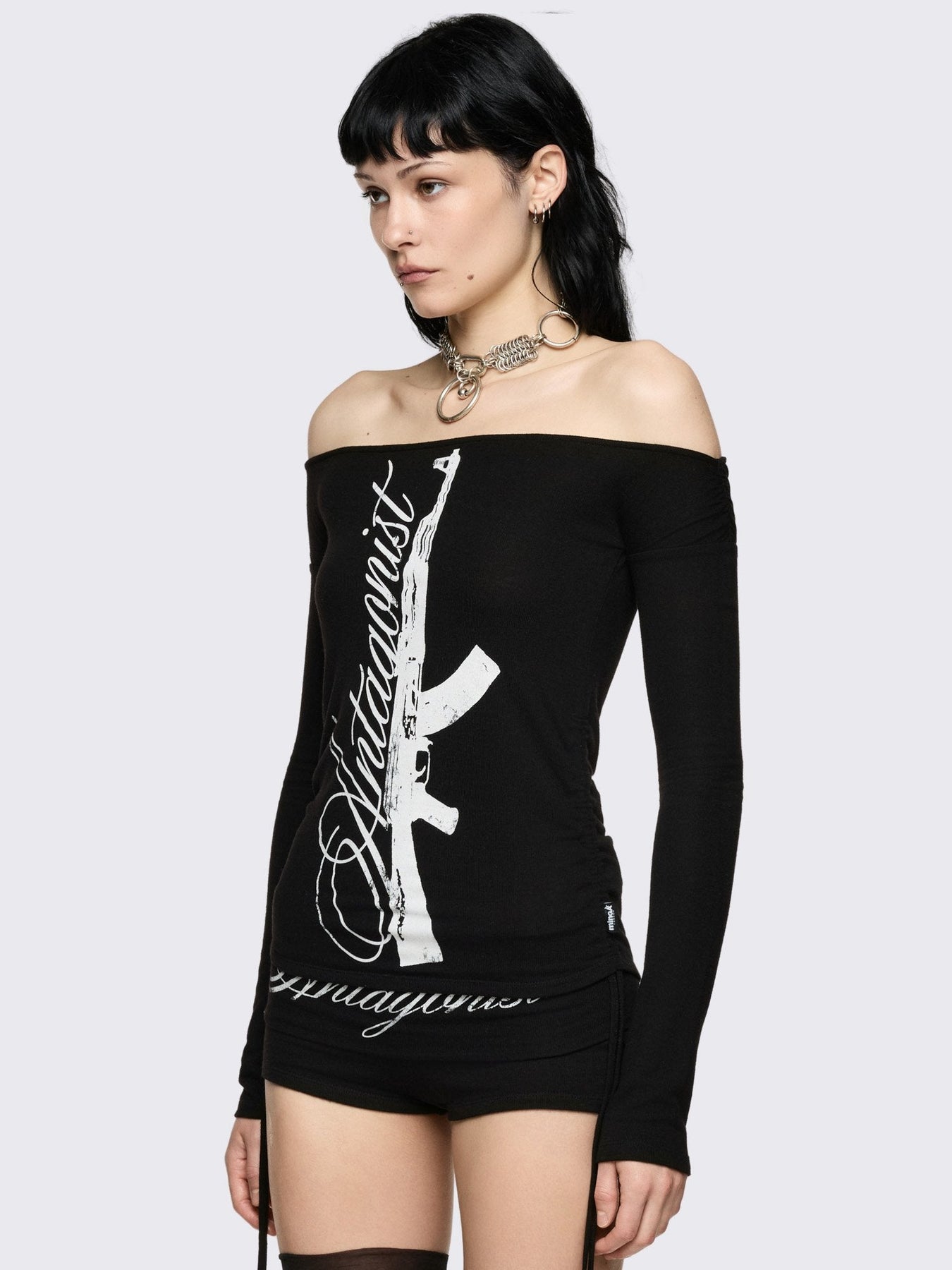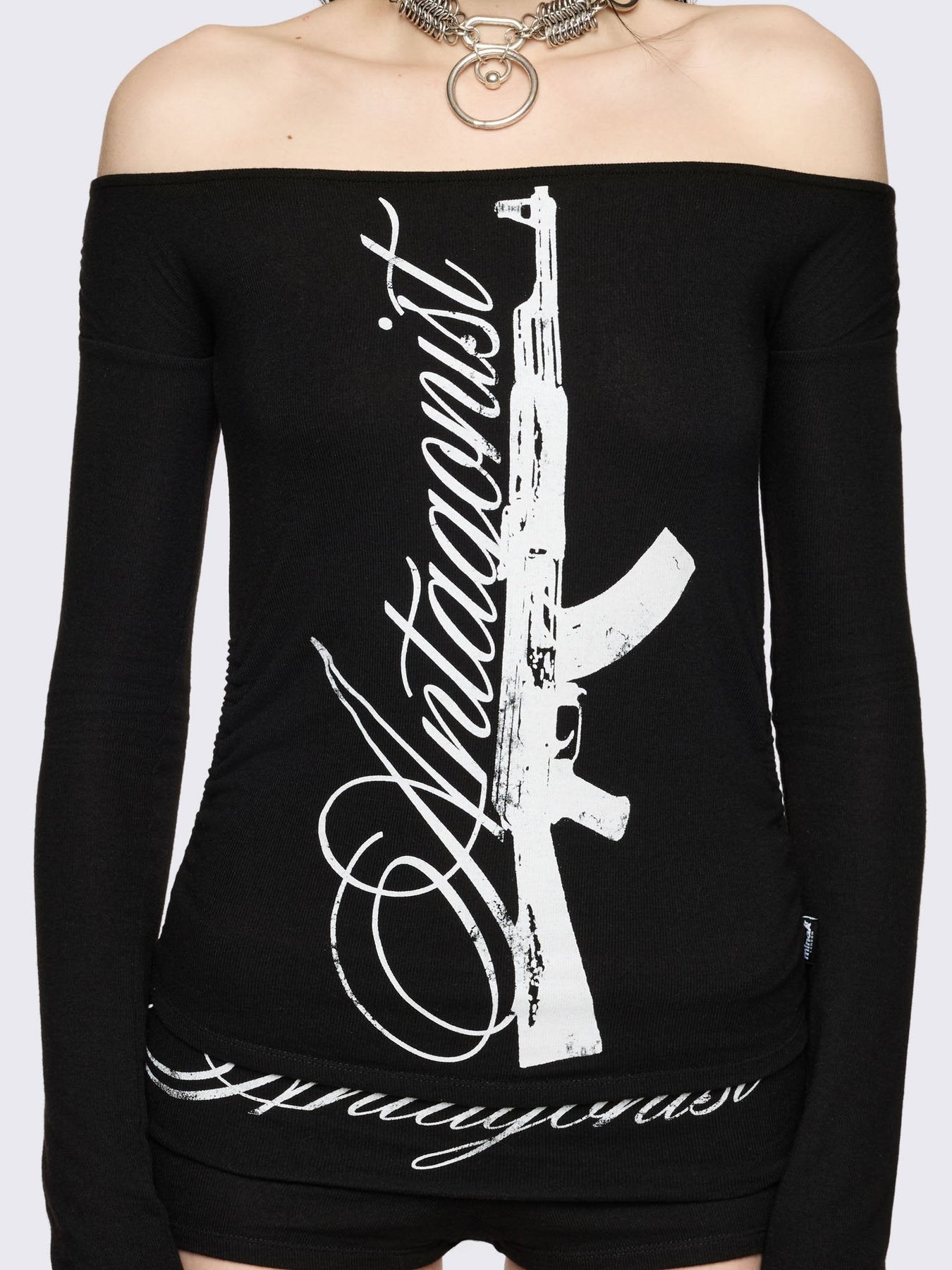Black long sleeve off-shoulder top with "Antagonist" gun graphic front print and ruched tie side