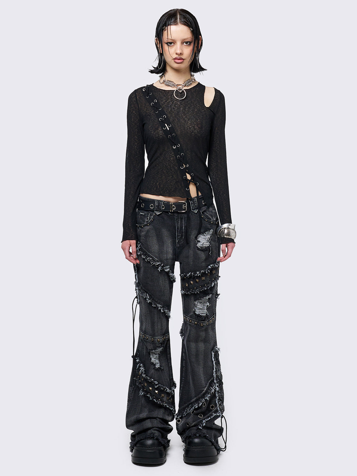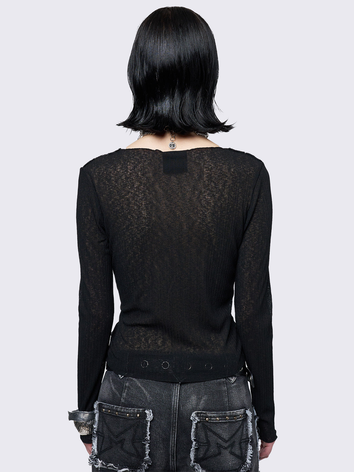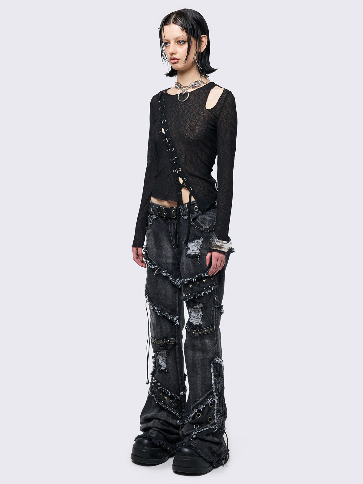 Asymmetric top in black with lace up and cut out detail. Grunge vibe.