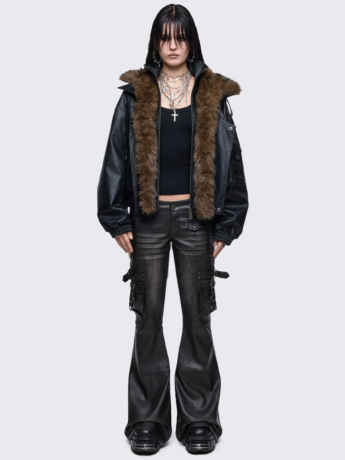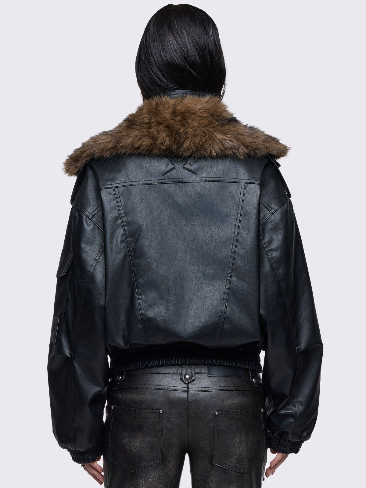 Black faux leather aviator jacket with detachable brown faux fur collar