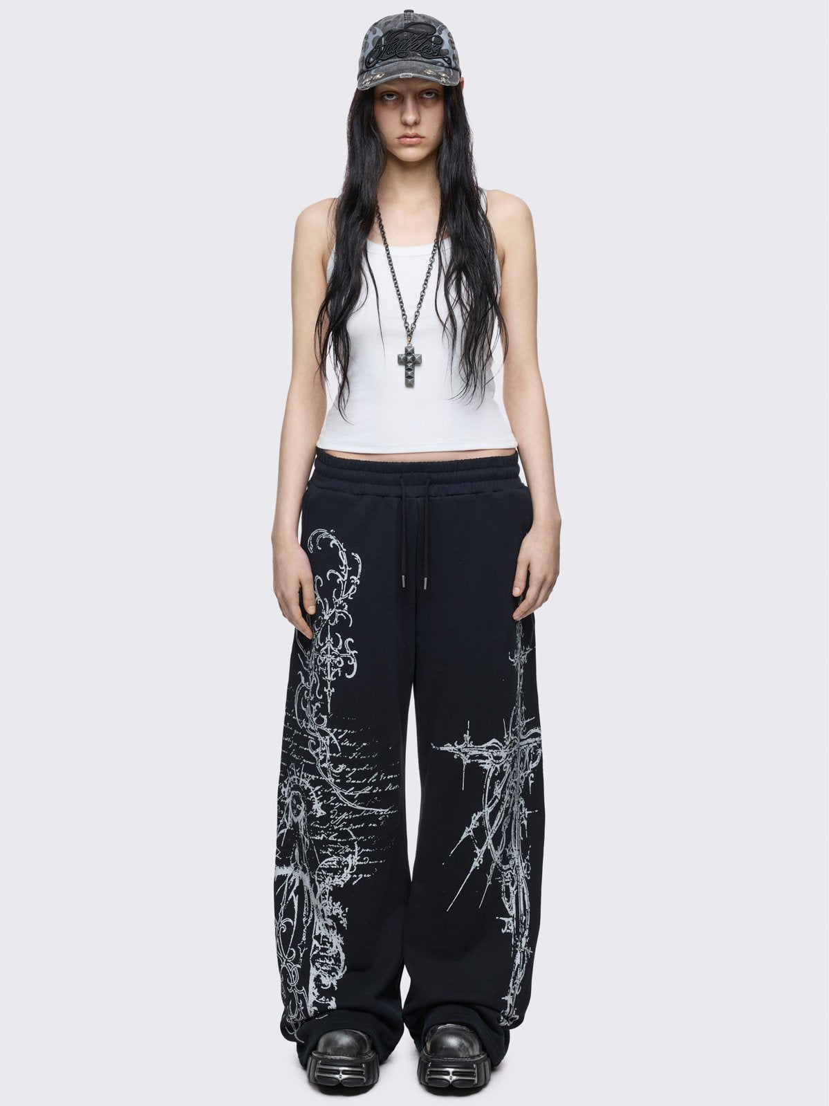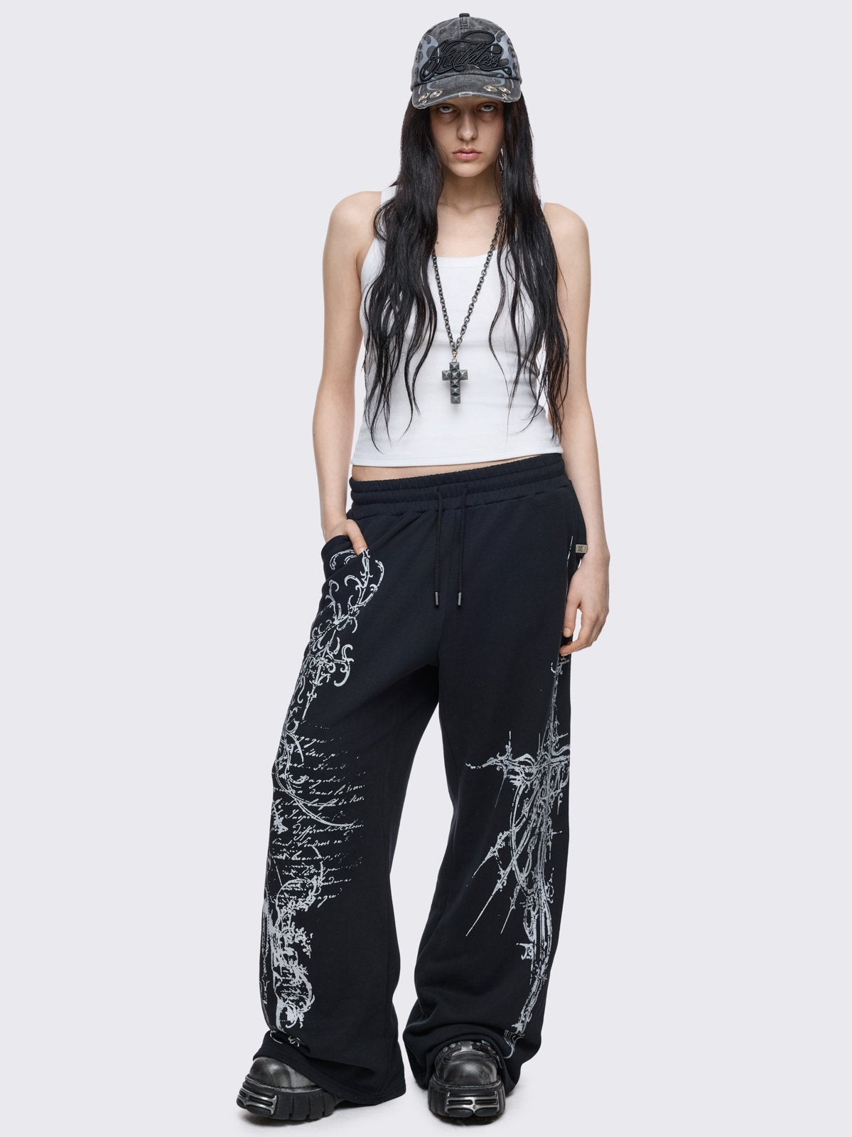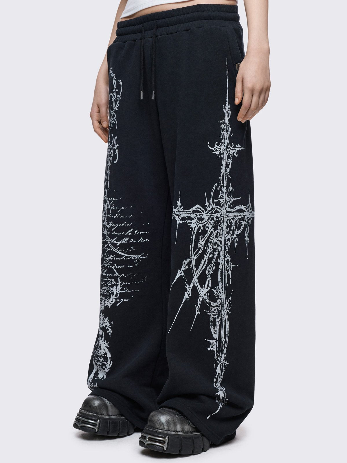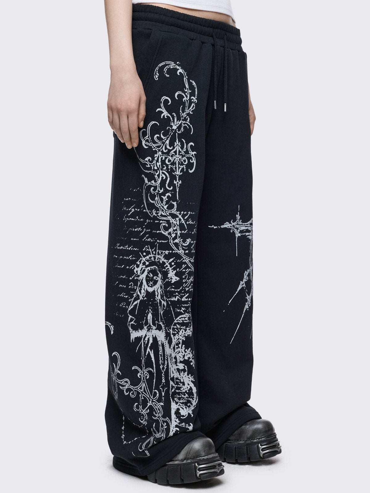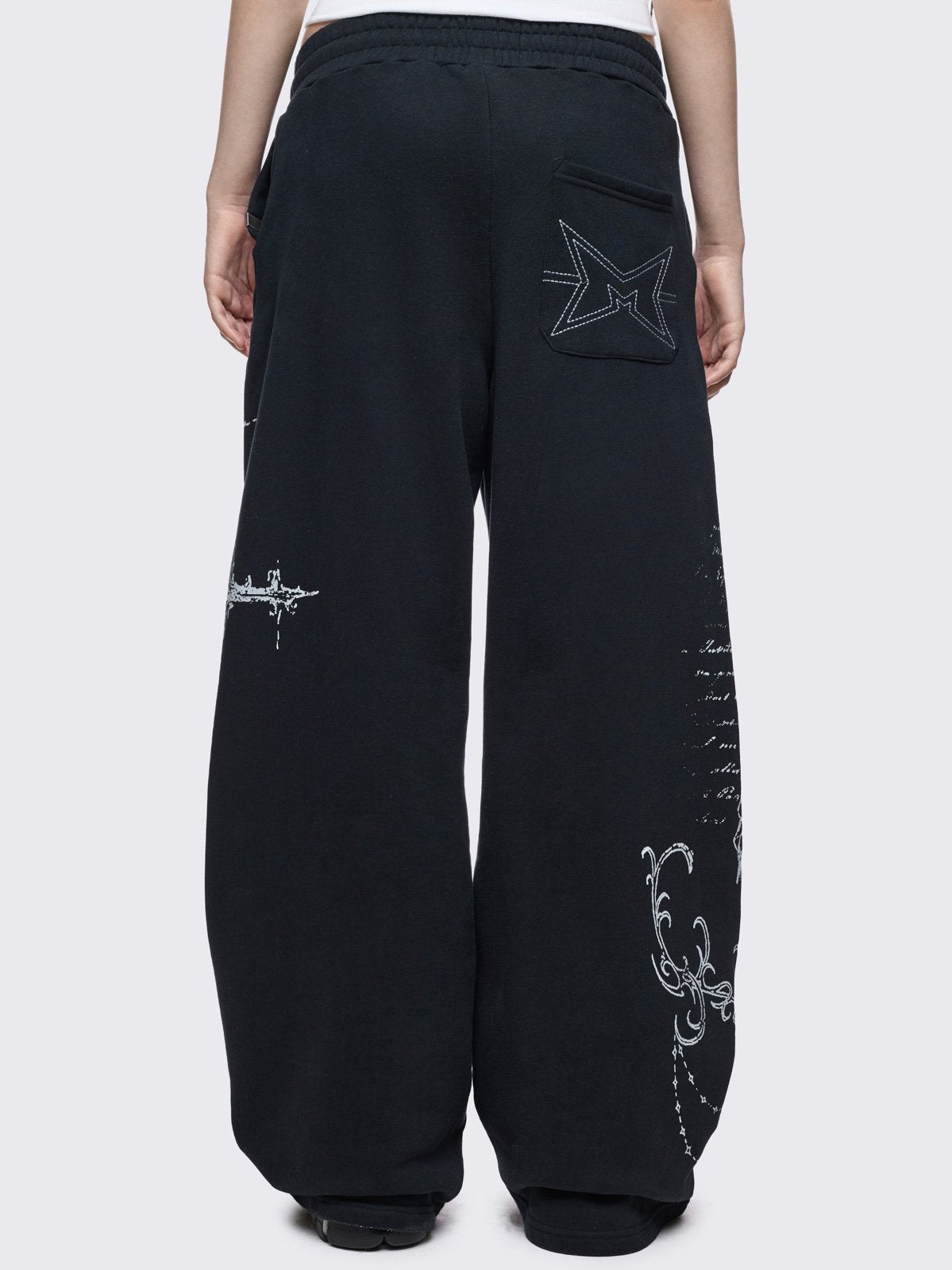 Black baggy sweatpants with white holy sigilism graphic print.