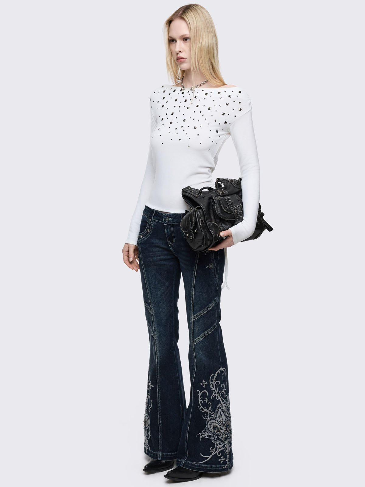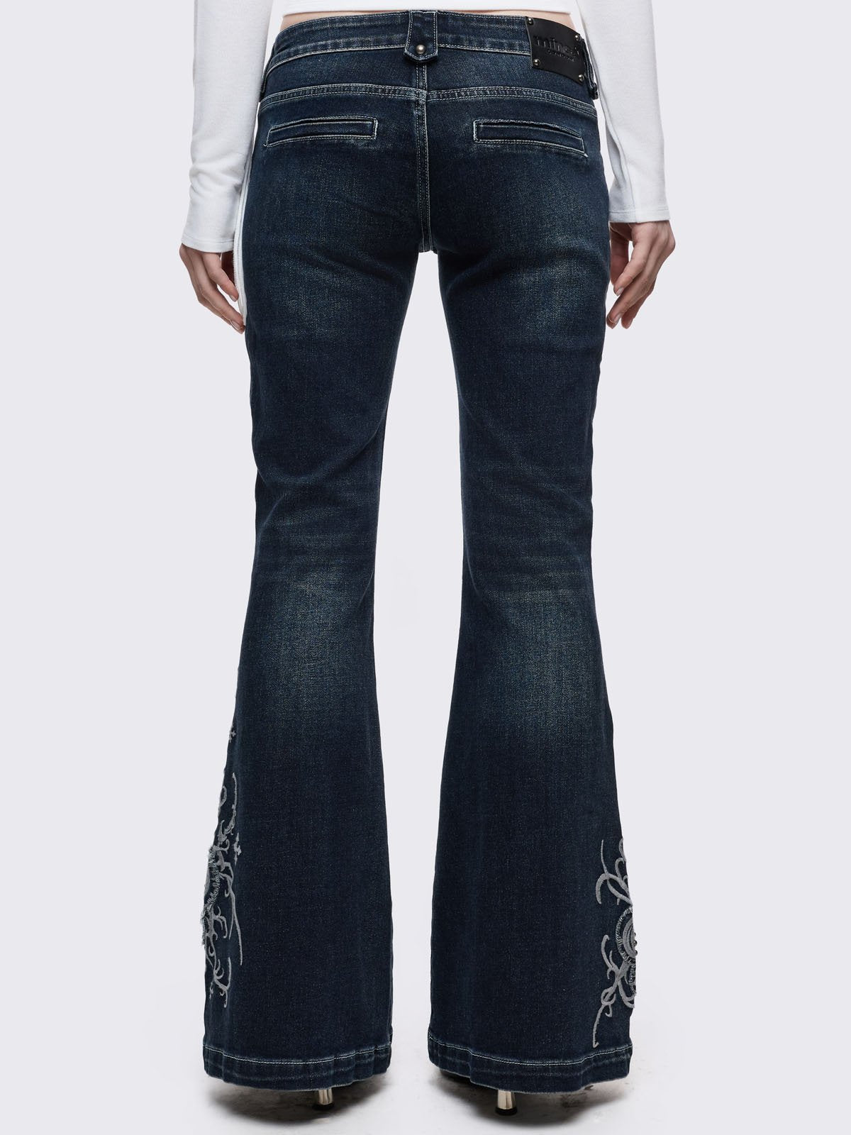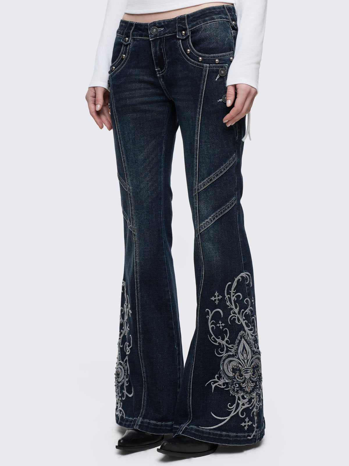 Dark blue wash flared jeans featuring gothic floral and fleur-de-lis embroidery on the lower legs and seams details.