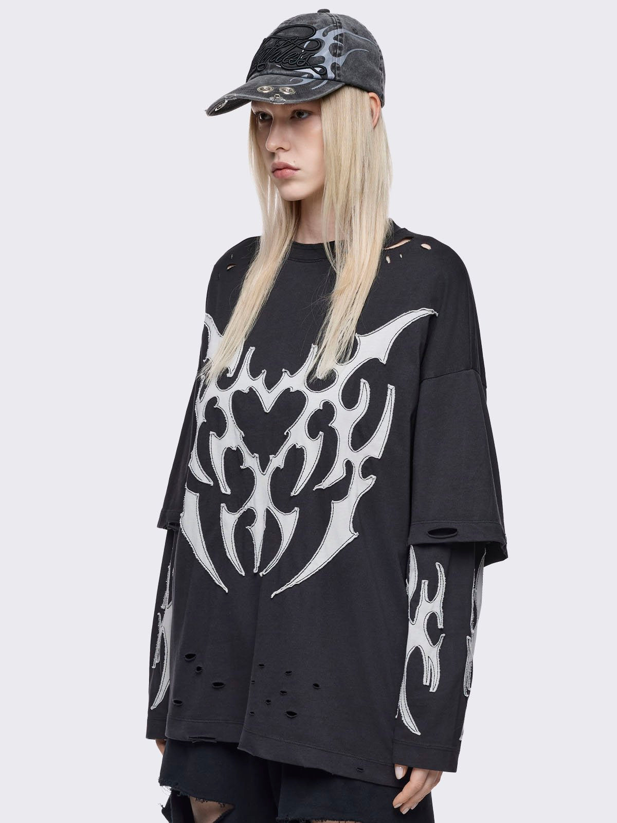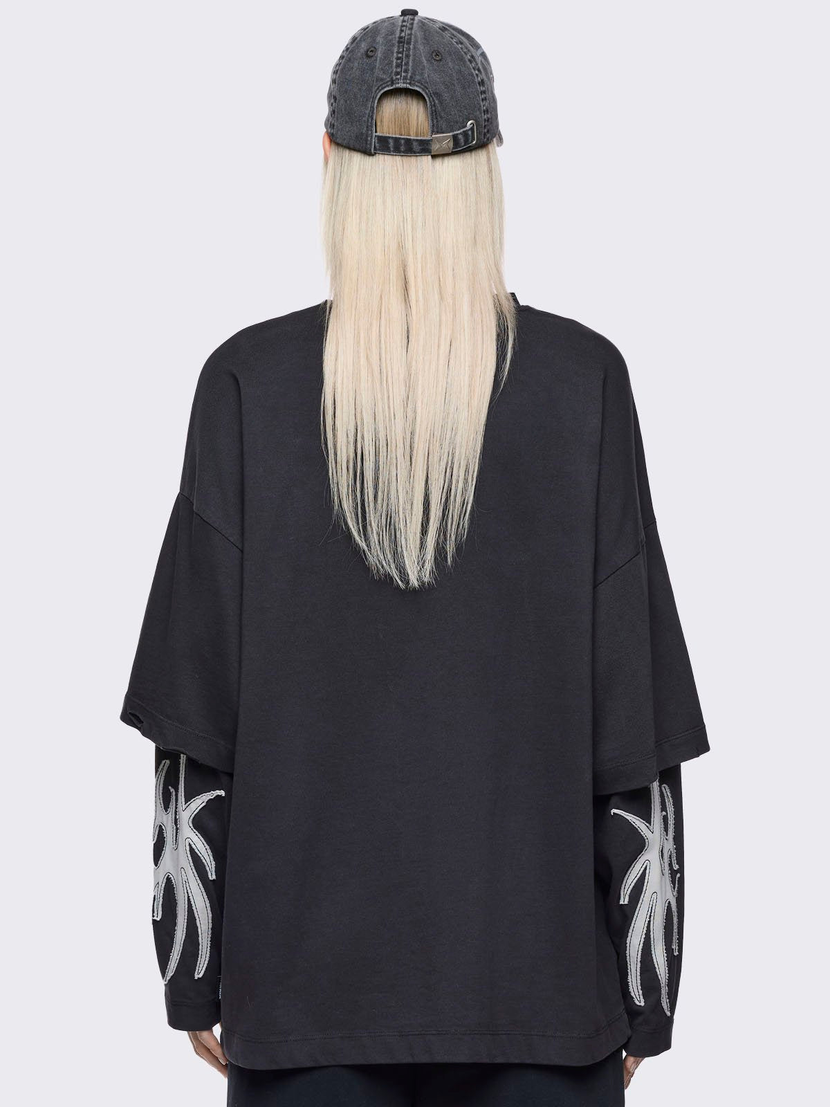 Black washed layered long sleeve t-shirt with heart and sigilism patches in light grey and distressed details