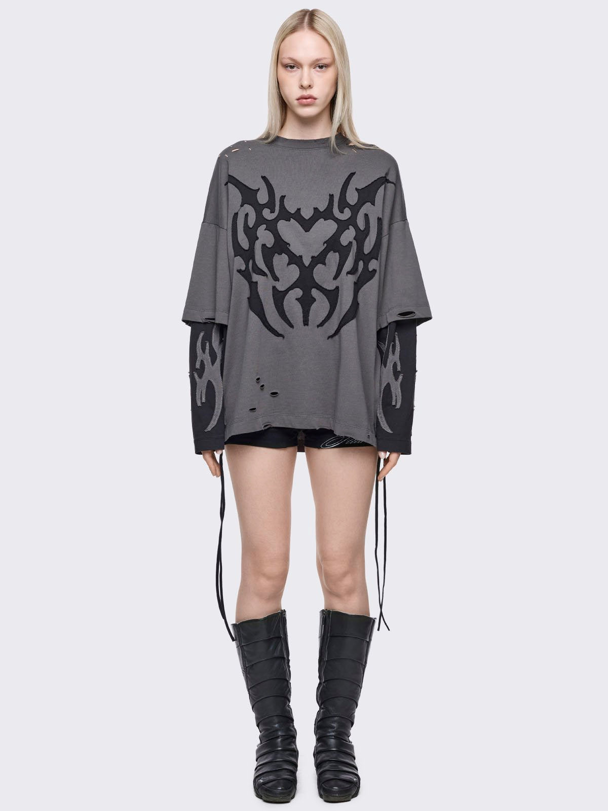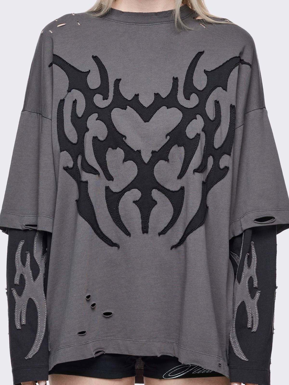 Grey distressed layered long sleeve t-shirt with heart and sigilism patches featuring contrast black sleeves.