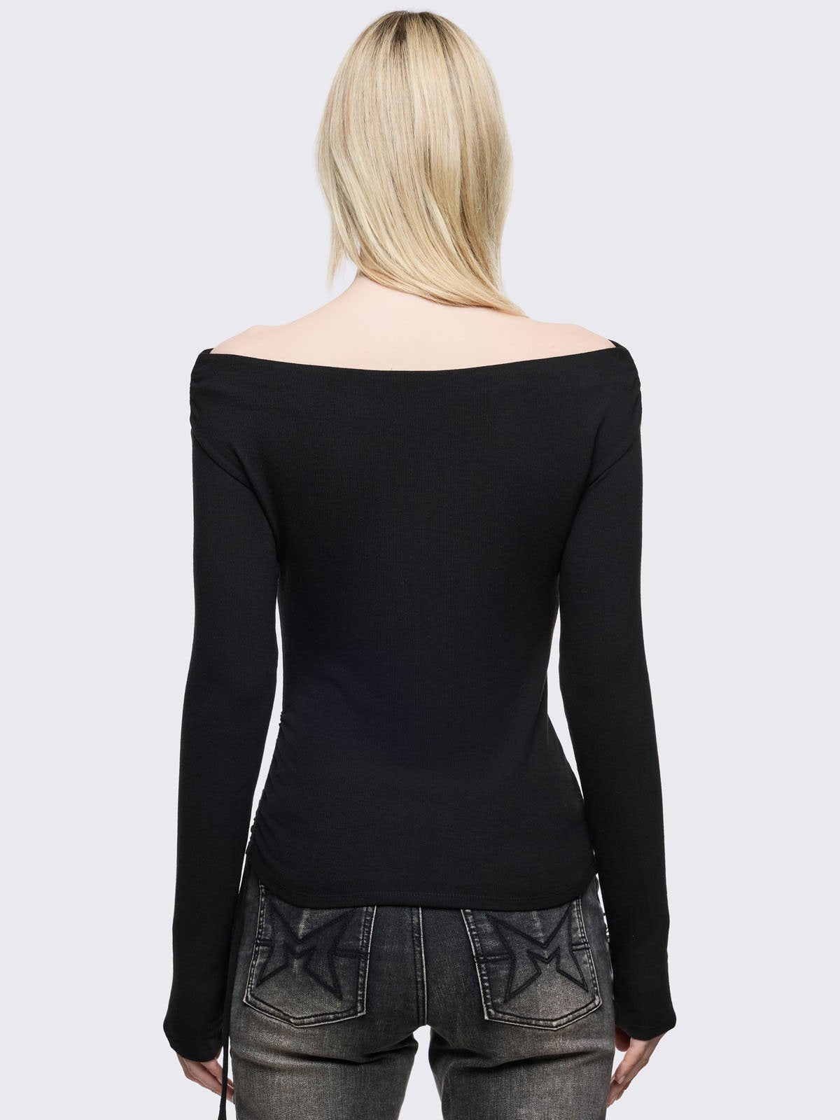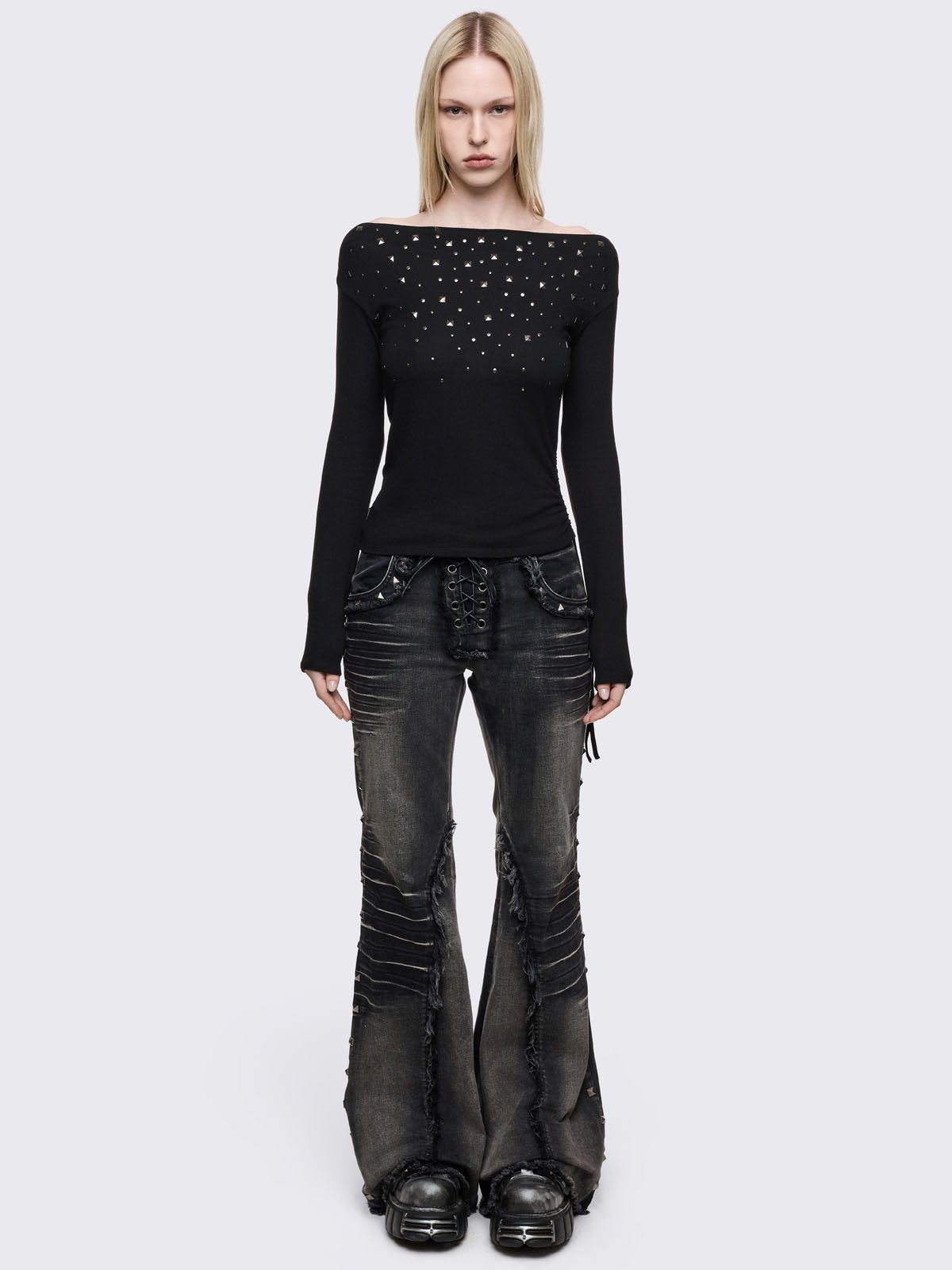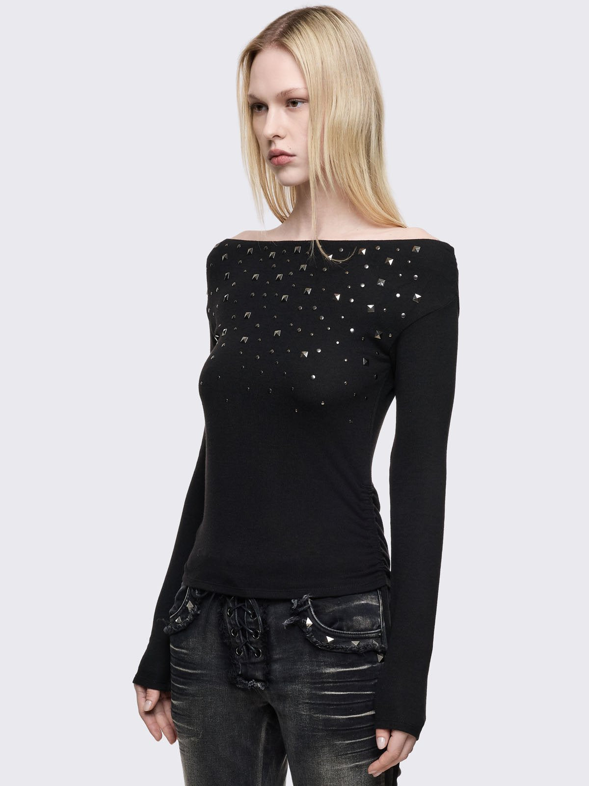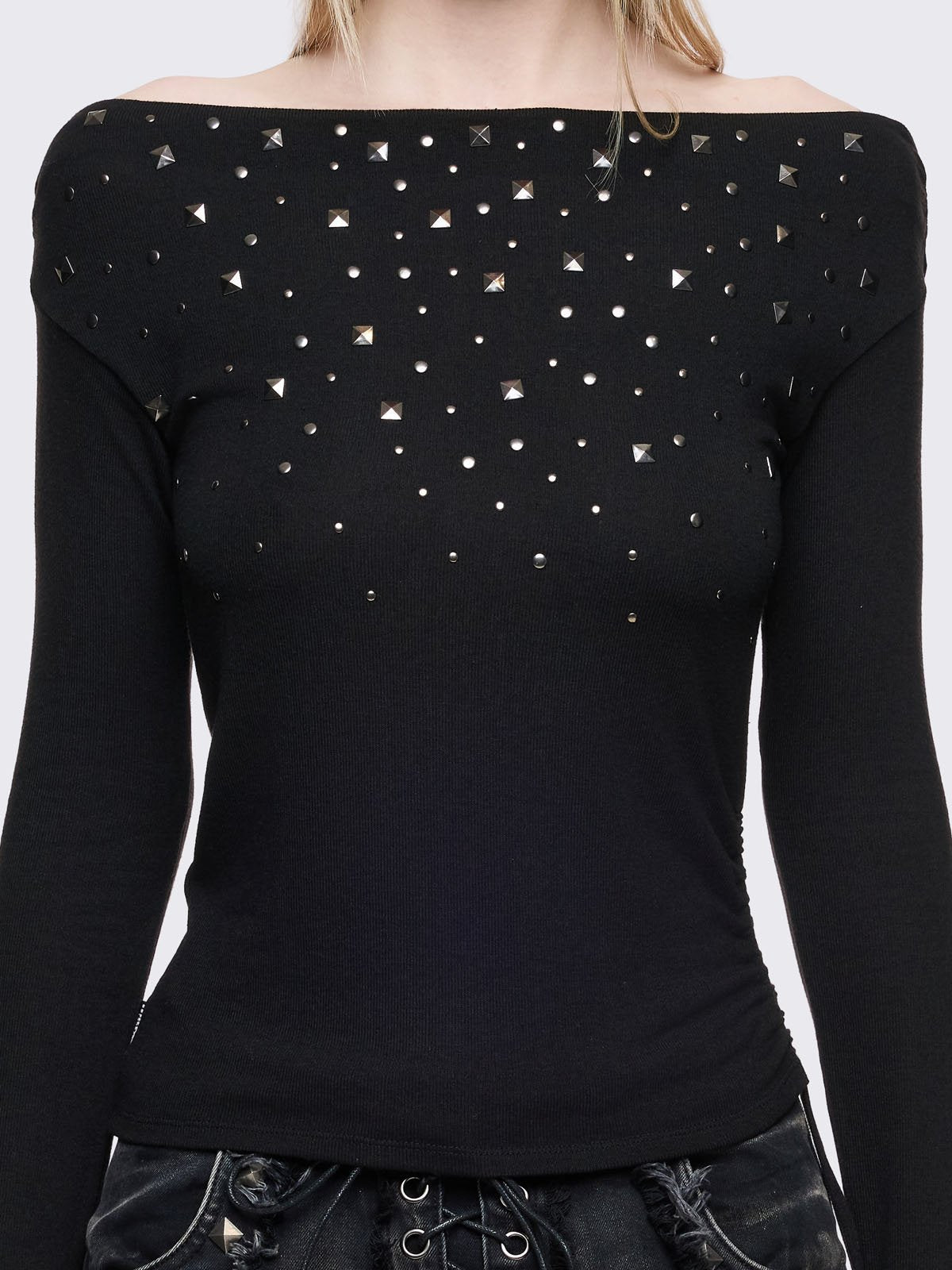 Black long sleeve top with stud details and off-shoulder style.