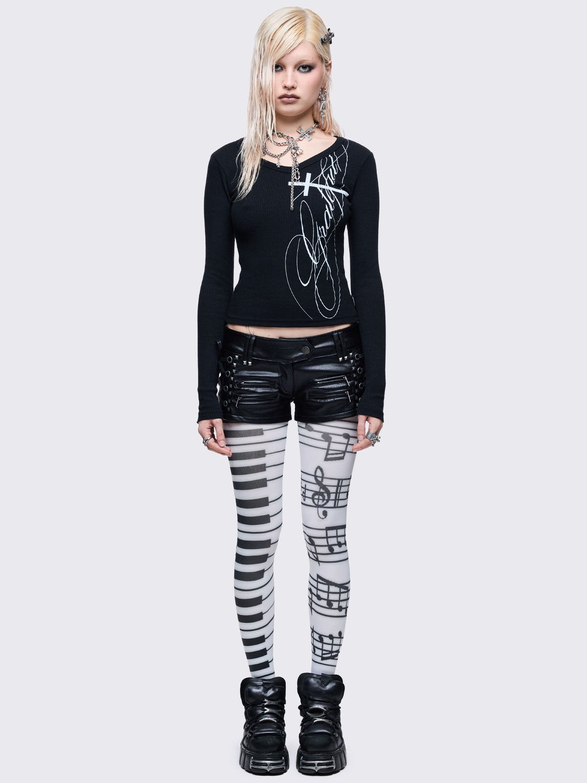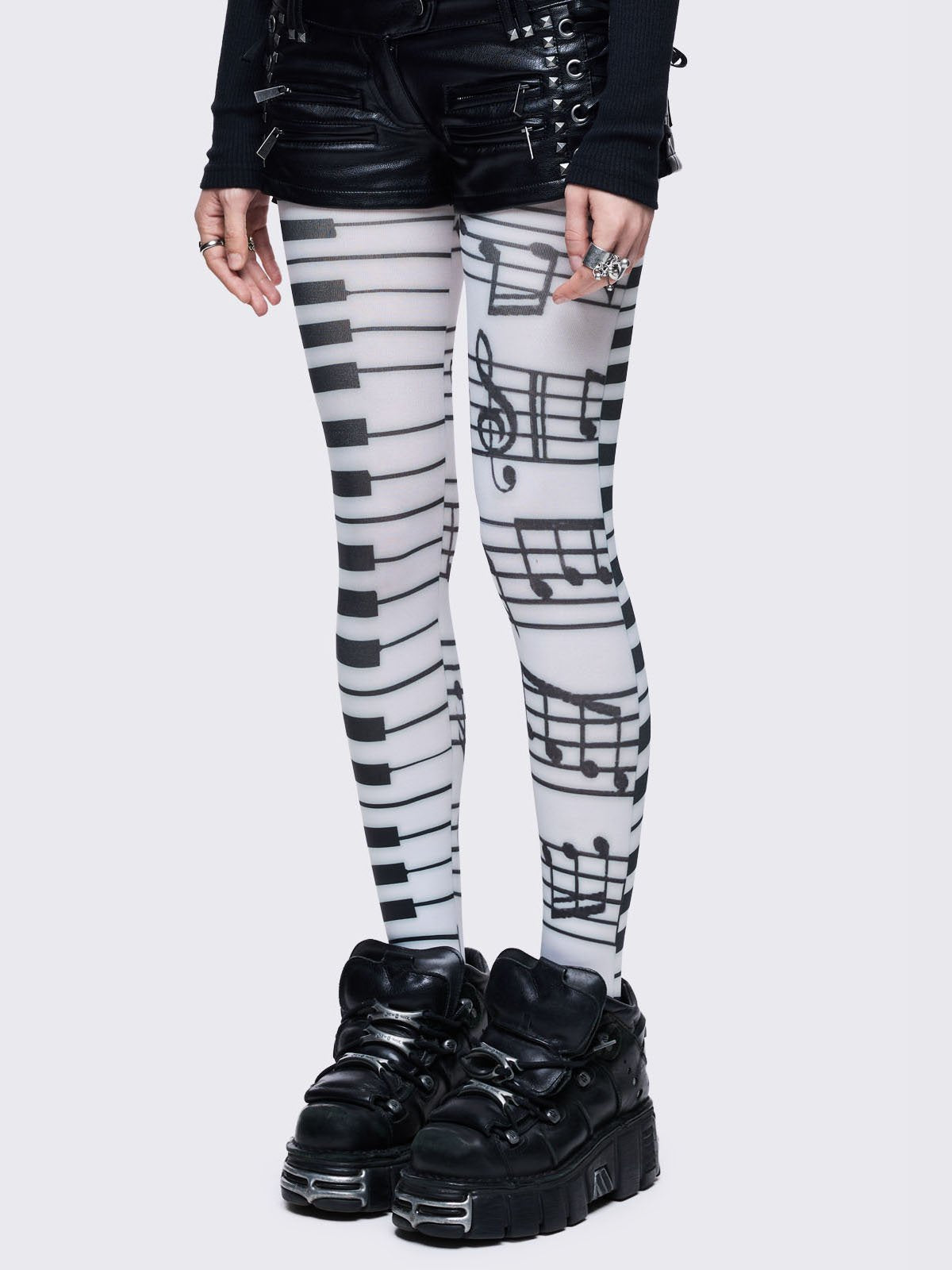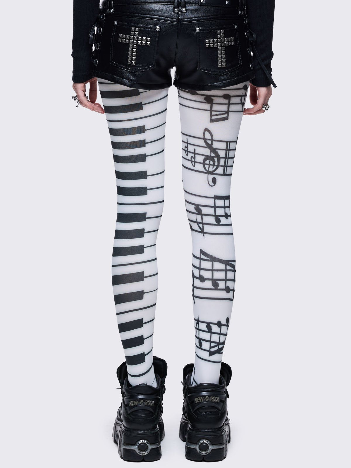 White tights featuring a split design: one leg has a black piano keyboard pattern, and the other has black musical notes and staves.