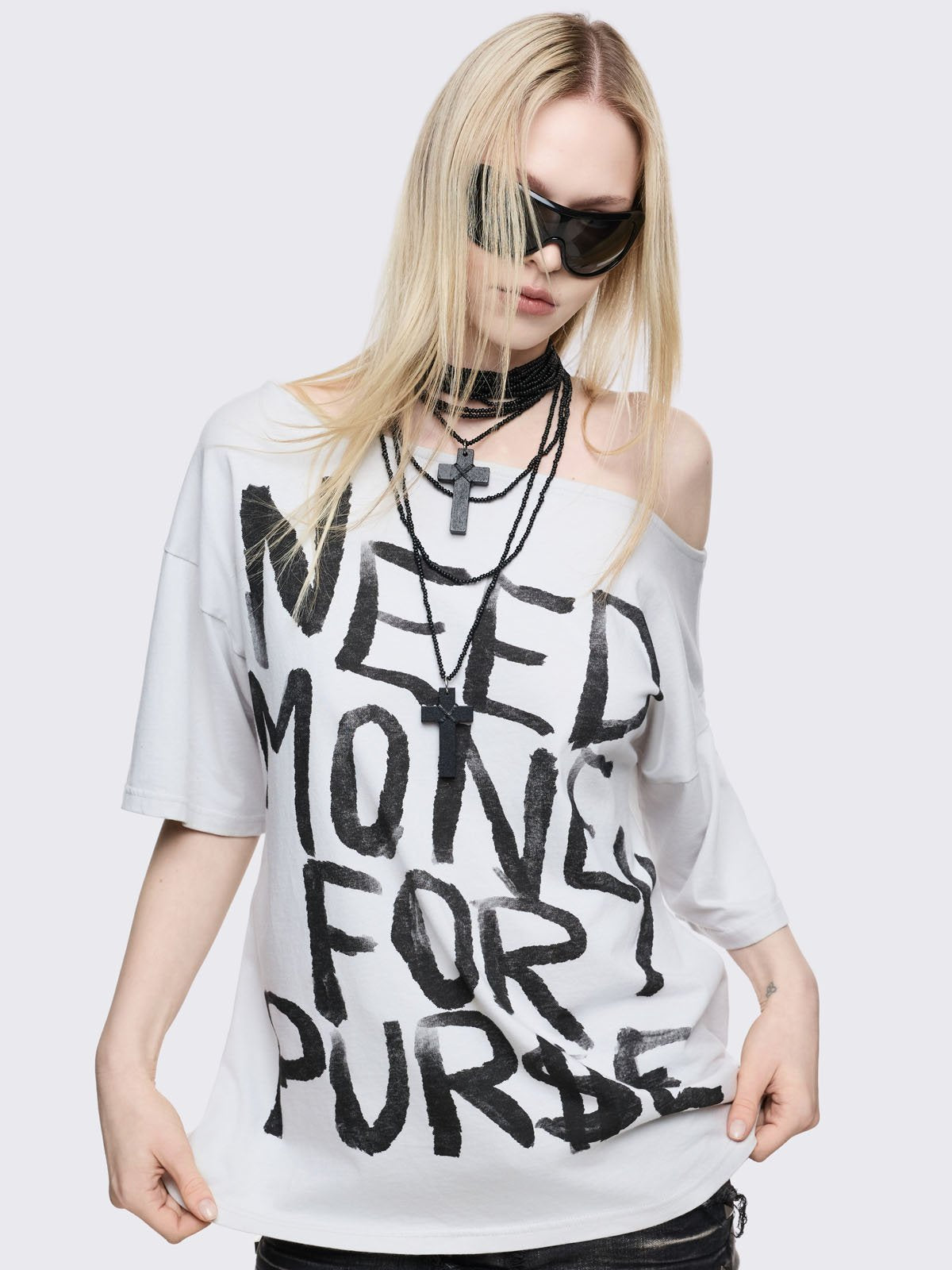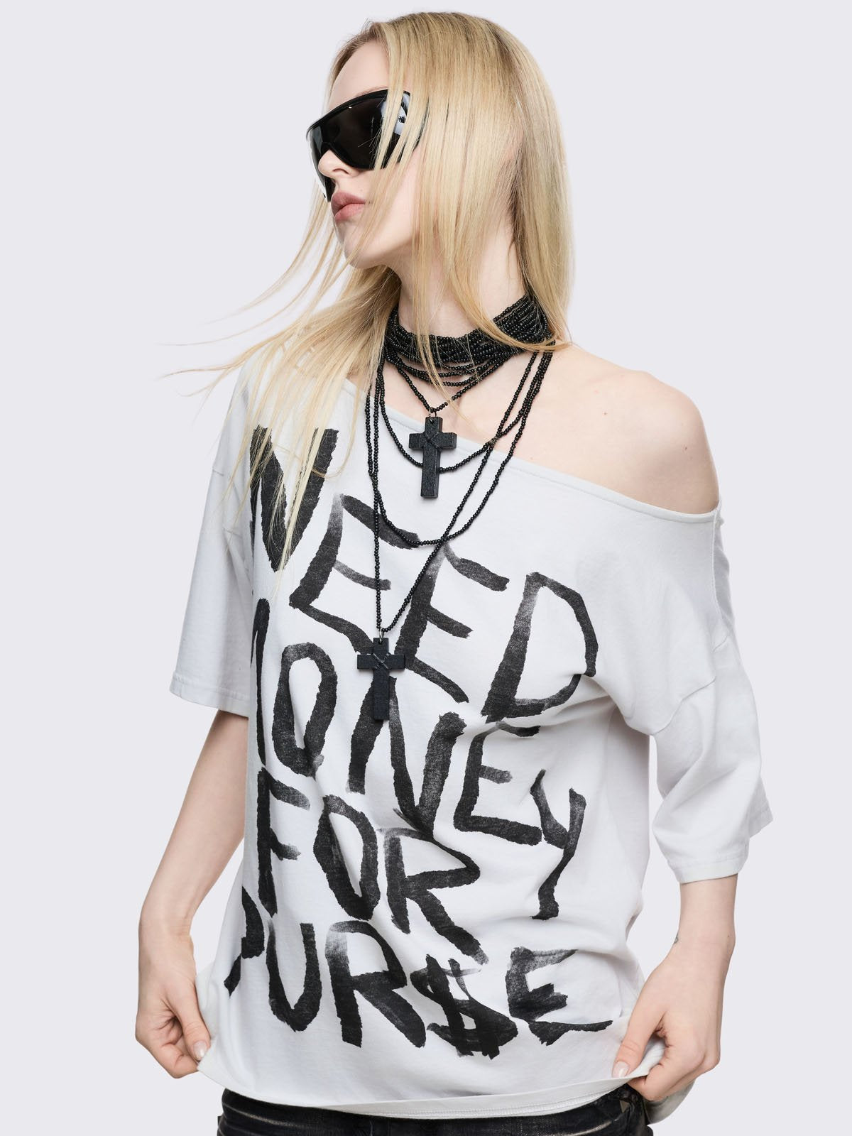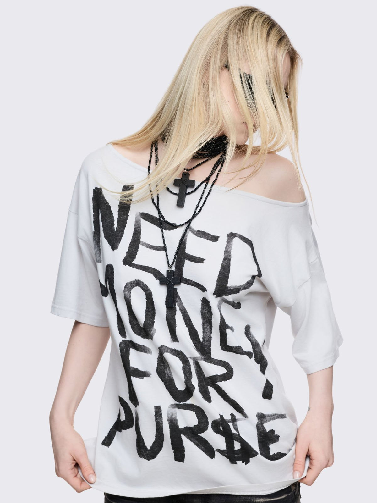 White oversized t-shirt with "Need money for pur$e" graphic front print and off-shoulder style.