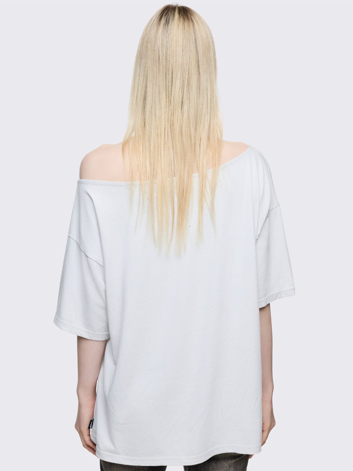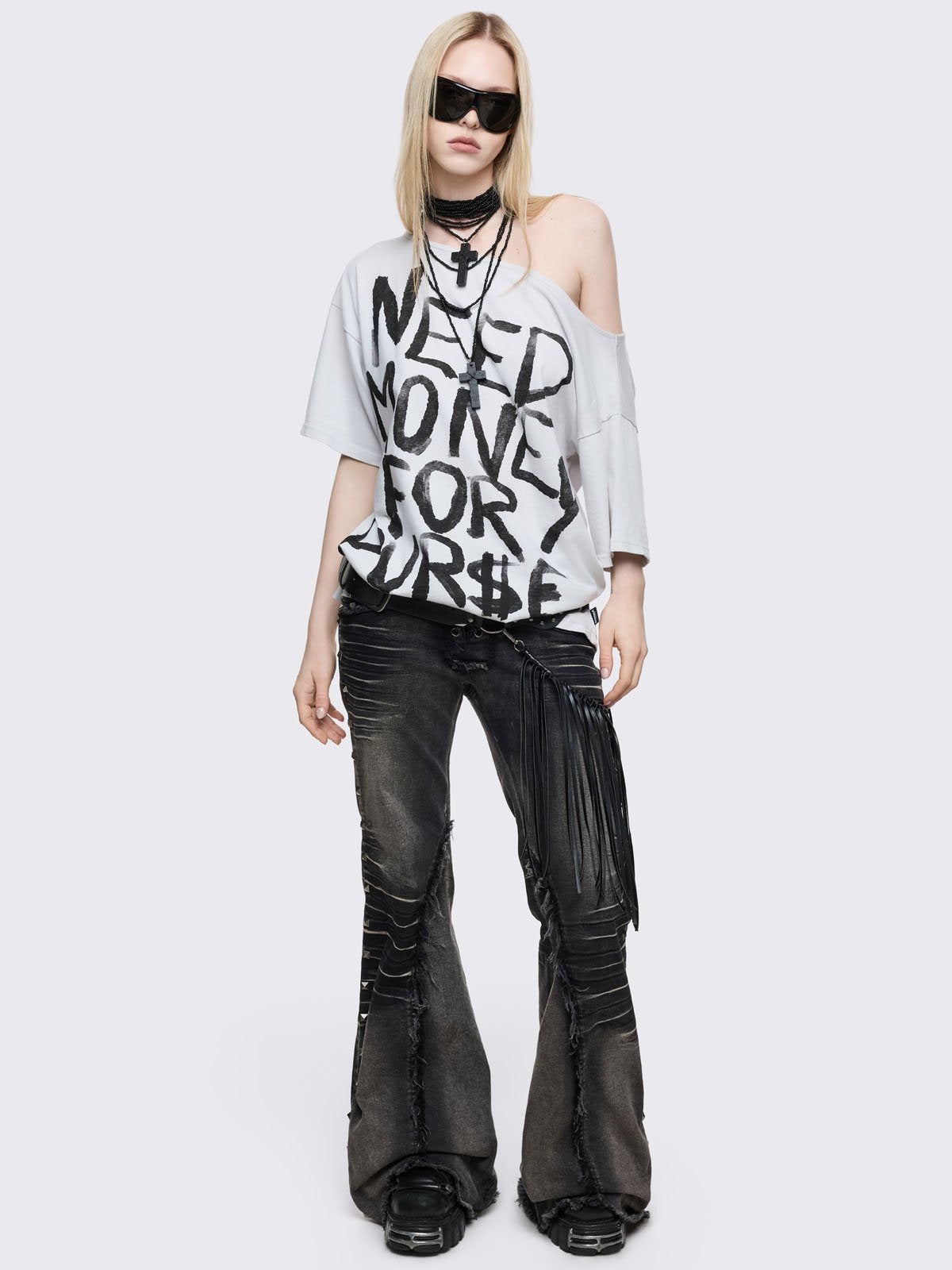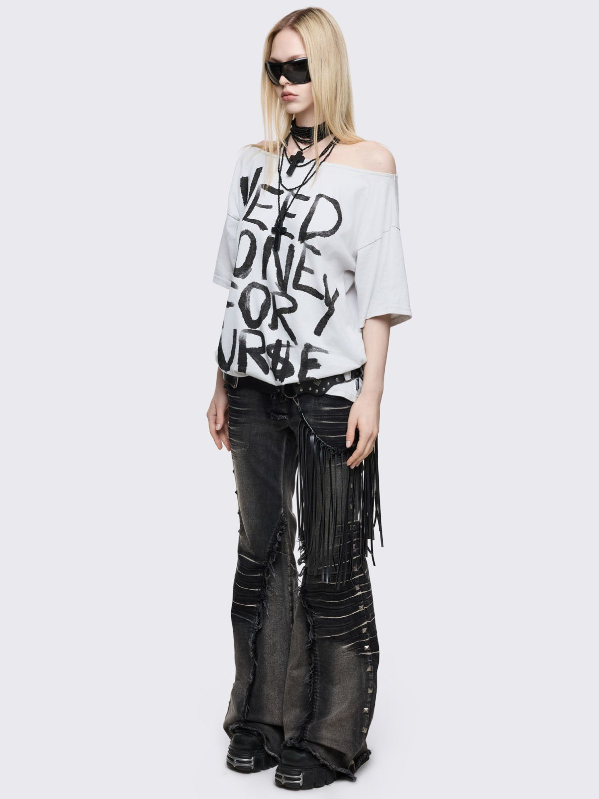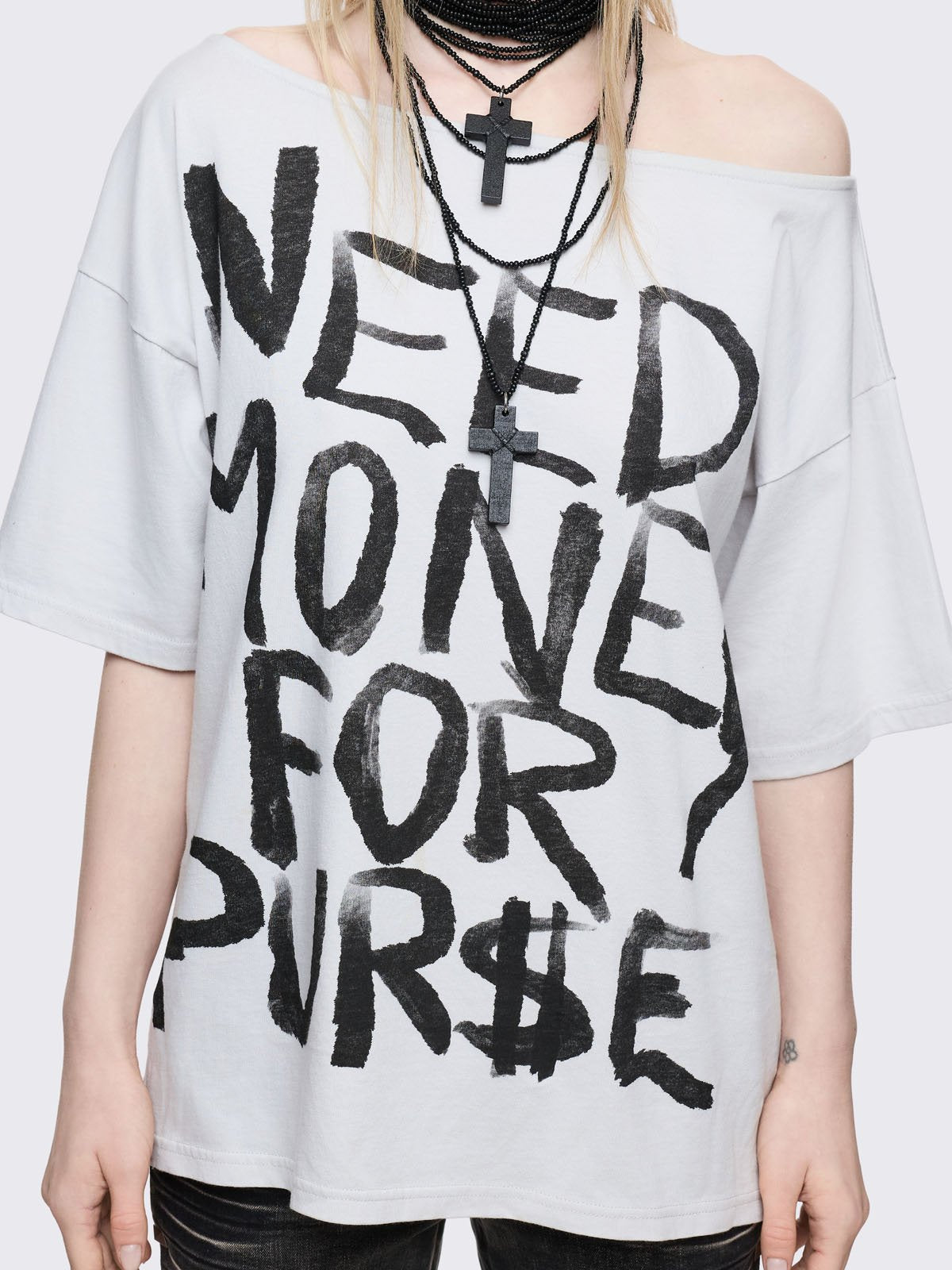 White oversized t-shirt with "Need money for pur$e" graphic front print and off-shoulder style.