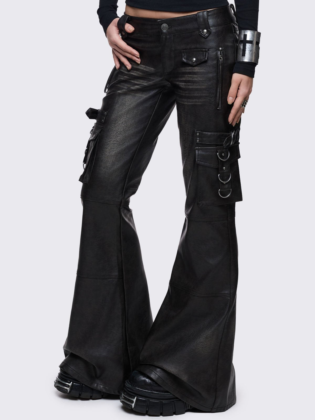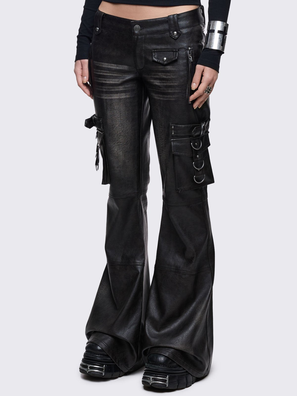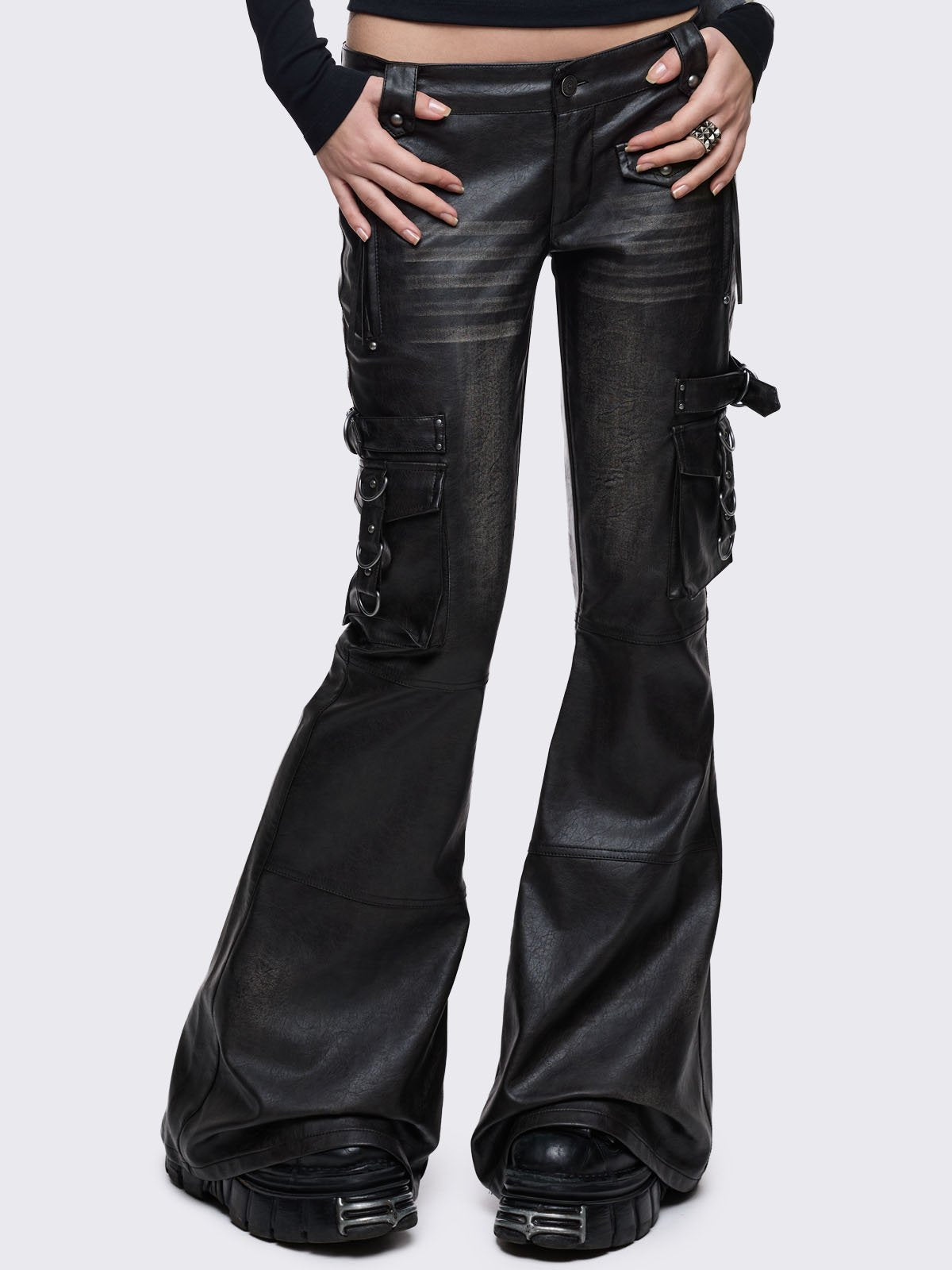 Low-rise black vegan leather pants with a dramatic flared leg, featuring oversized 3D cargo pockets with silver hardware and a vintage washed effect.