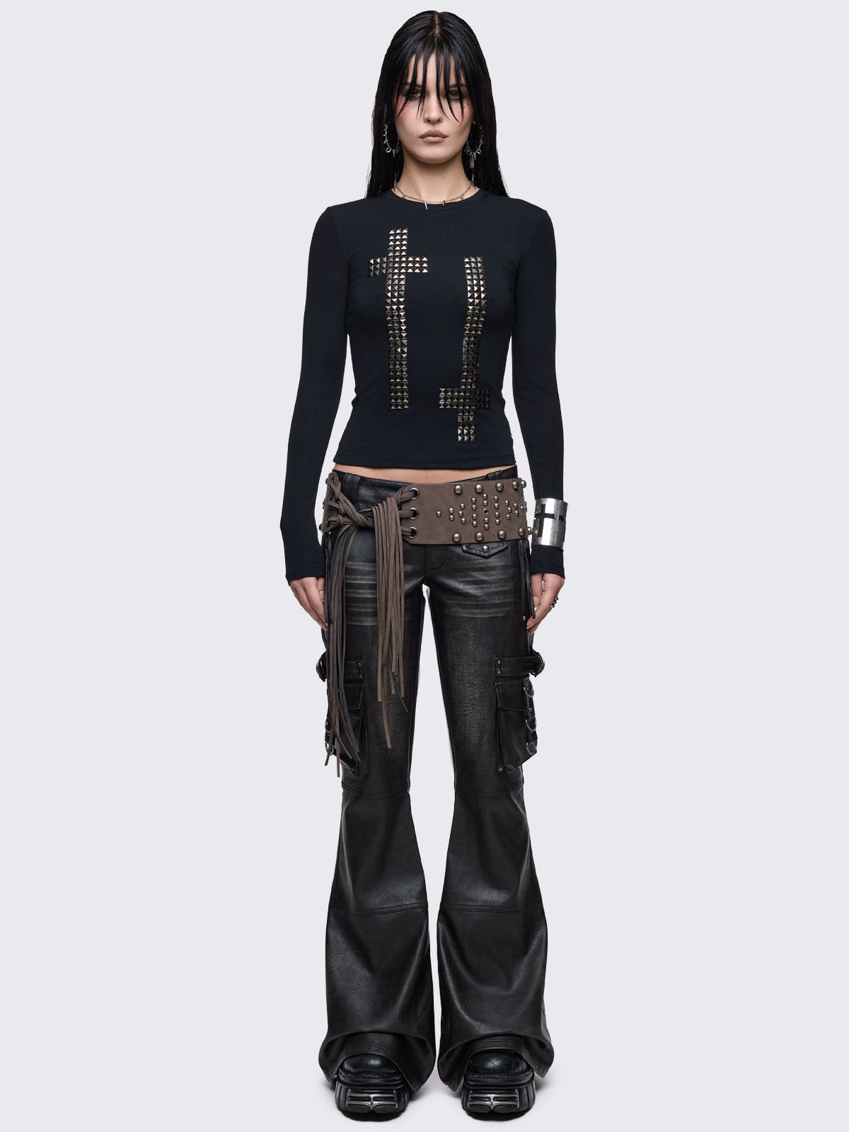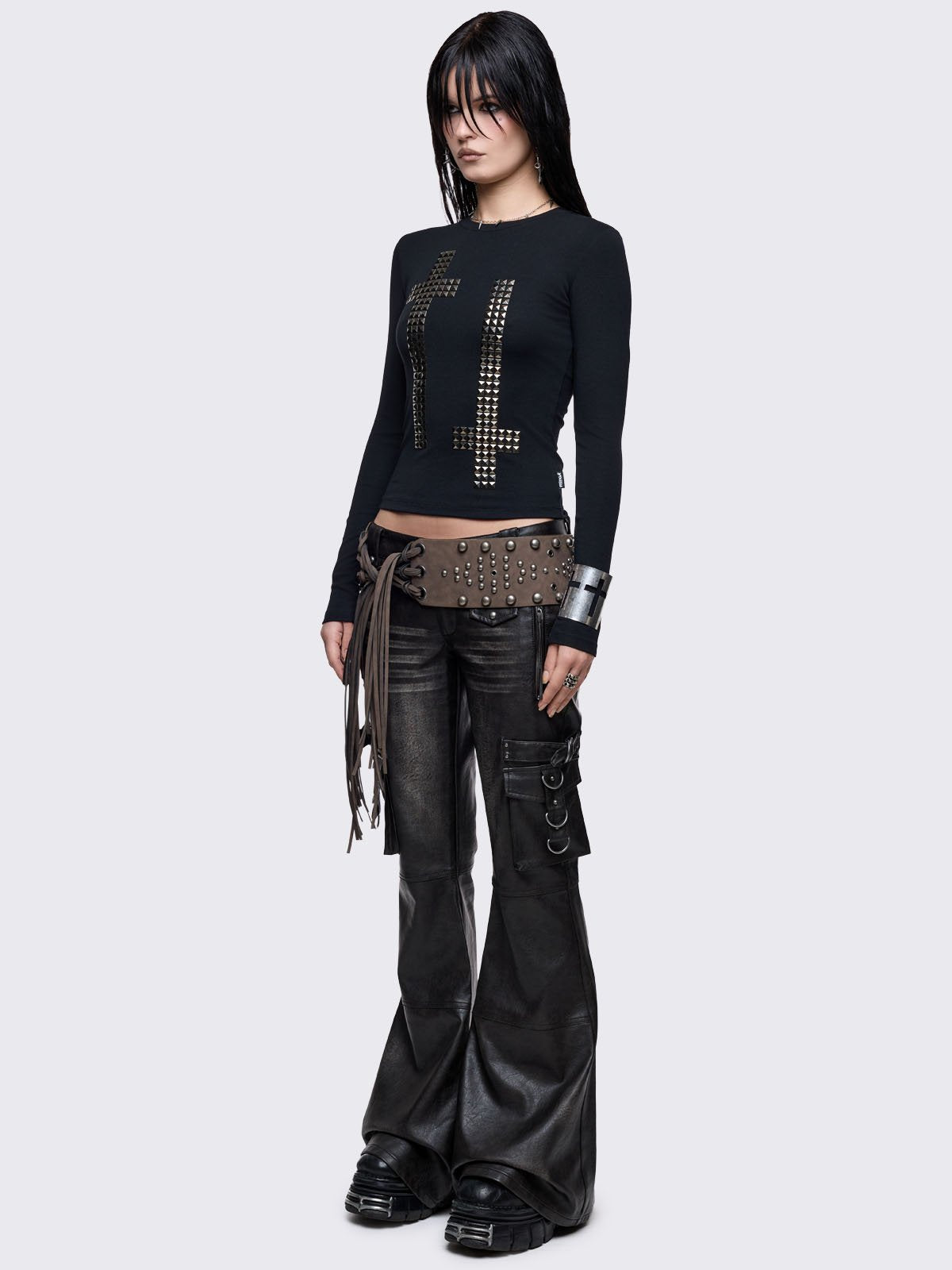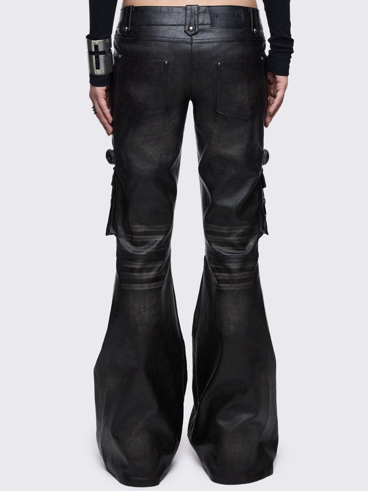 Low-rise black vegan leather pants with a dramatic flared leg, featuring oversized 3D cargo pockets with silver hardware and a vintage washed effect.