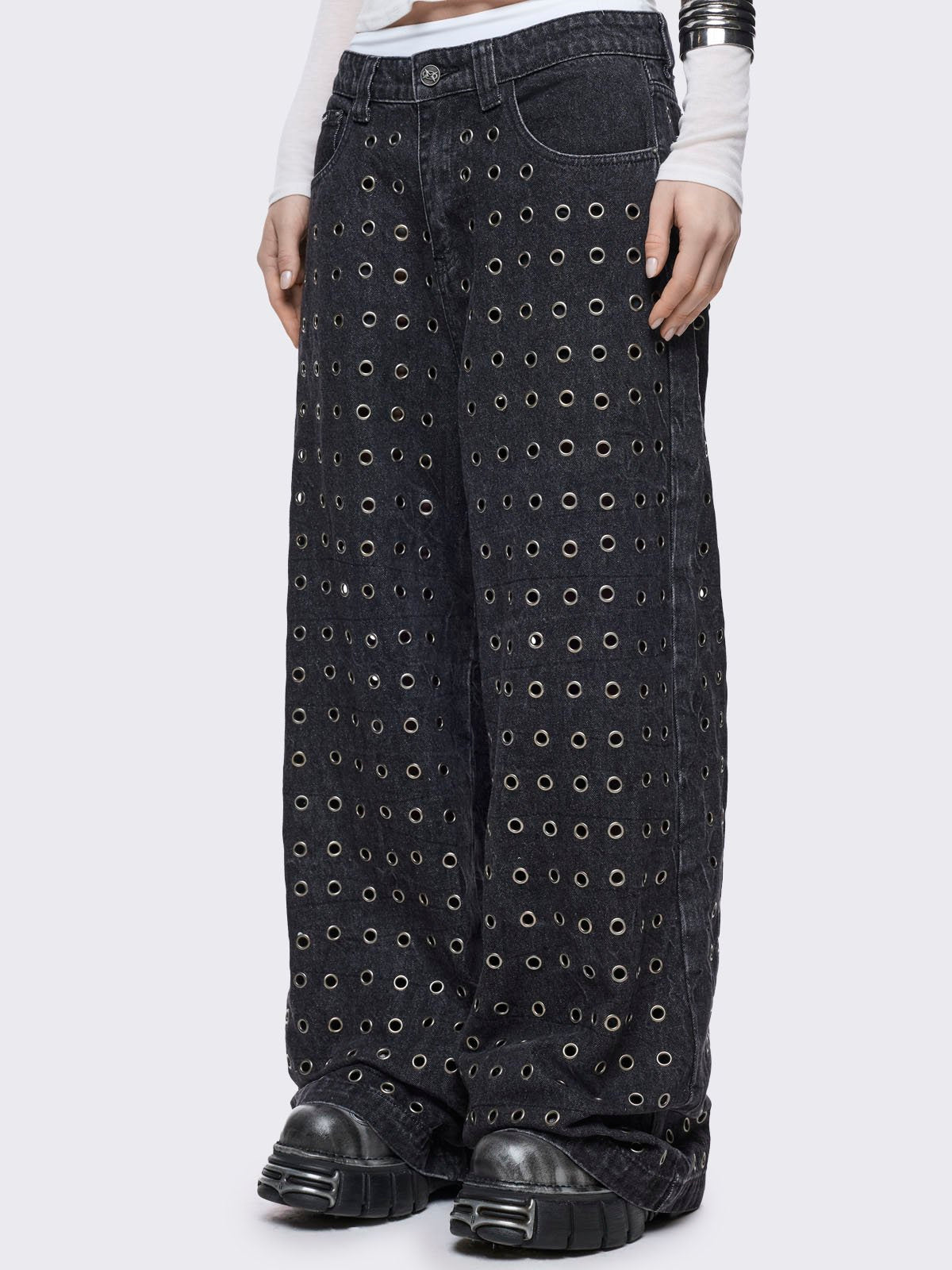 Black washed denim oversize bomber jacket with silver eyelets and seam details.