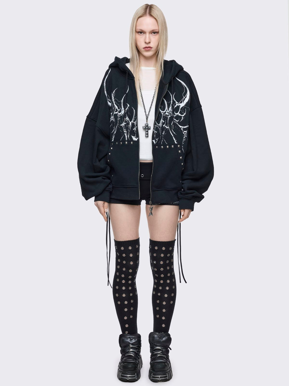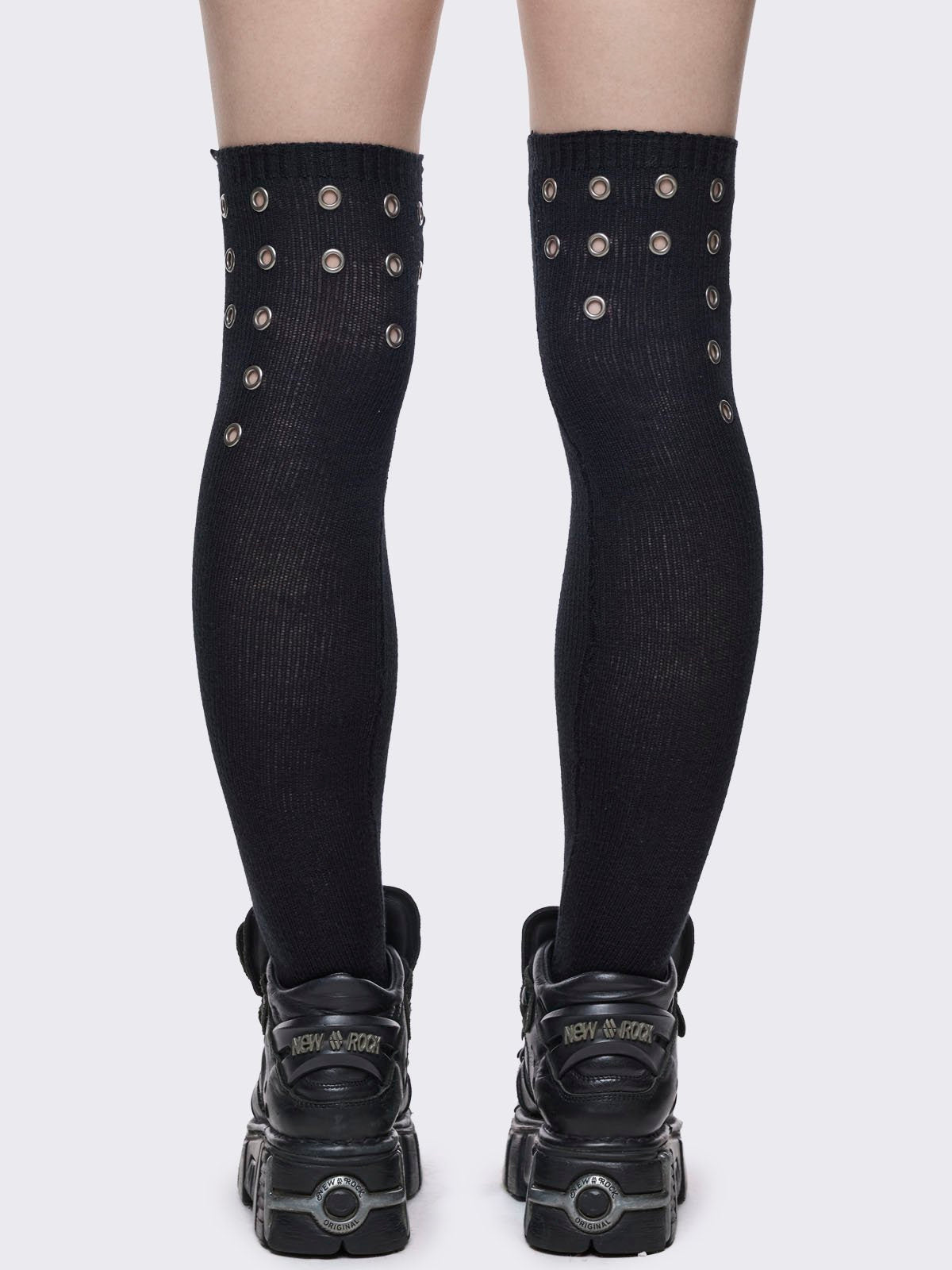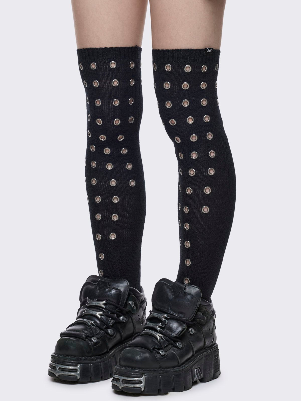 Black opaque thigh highs socks with all over silver eyelets.