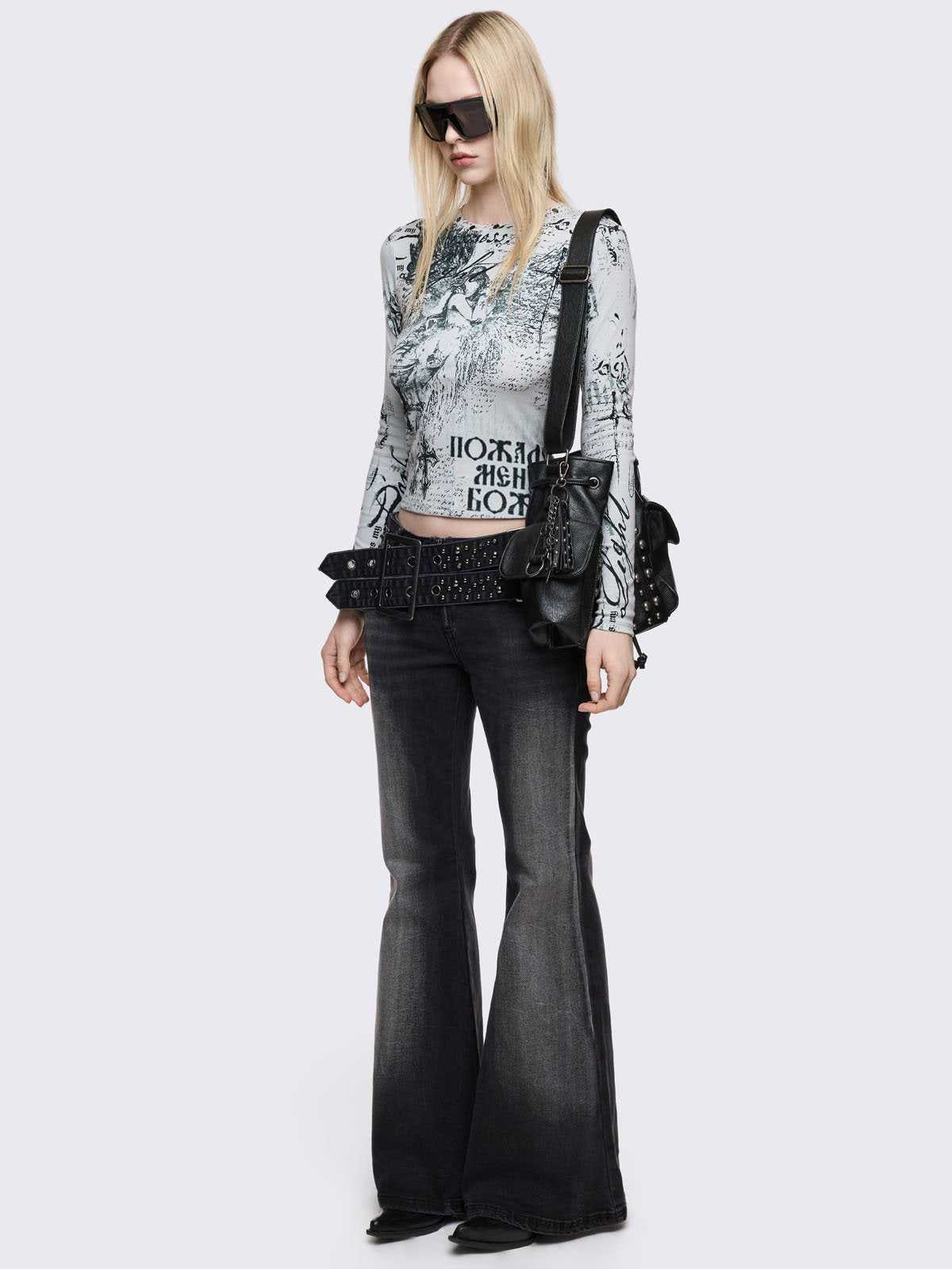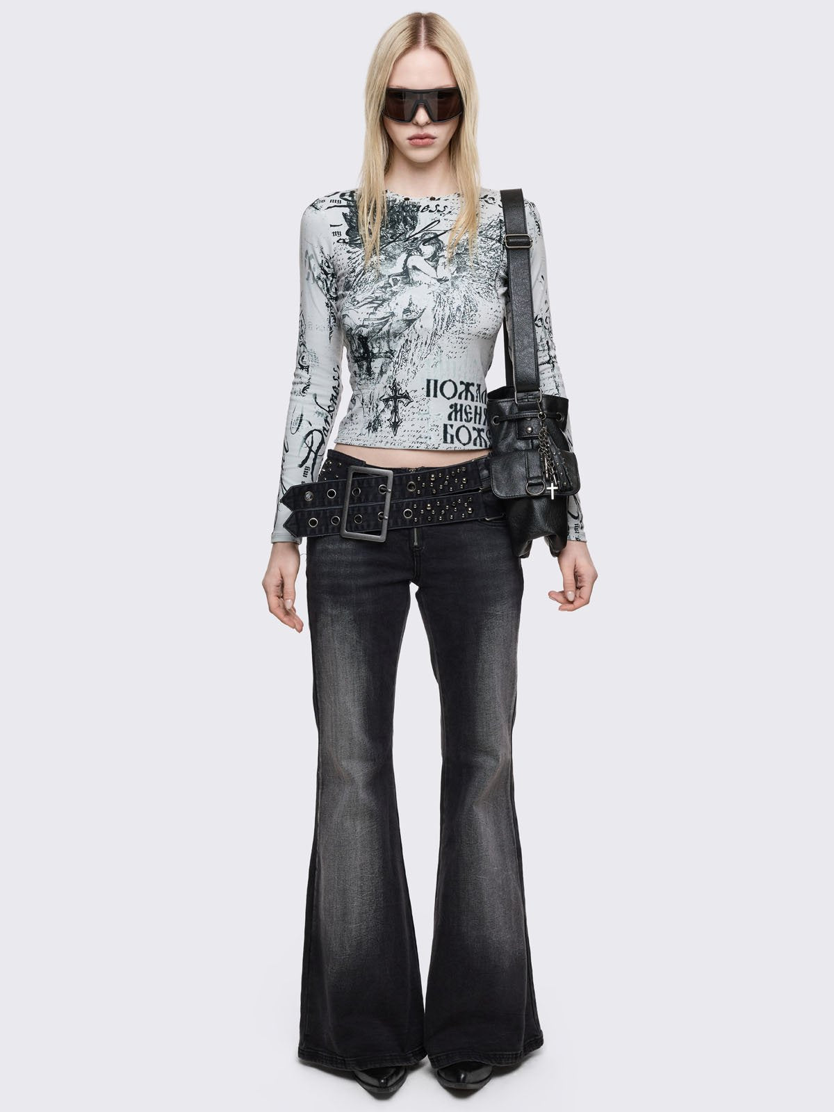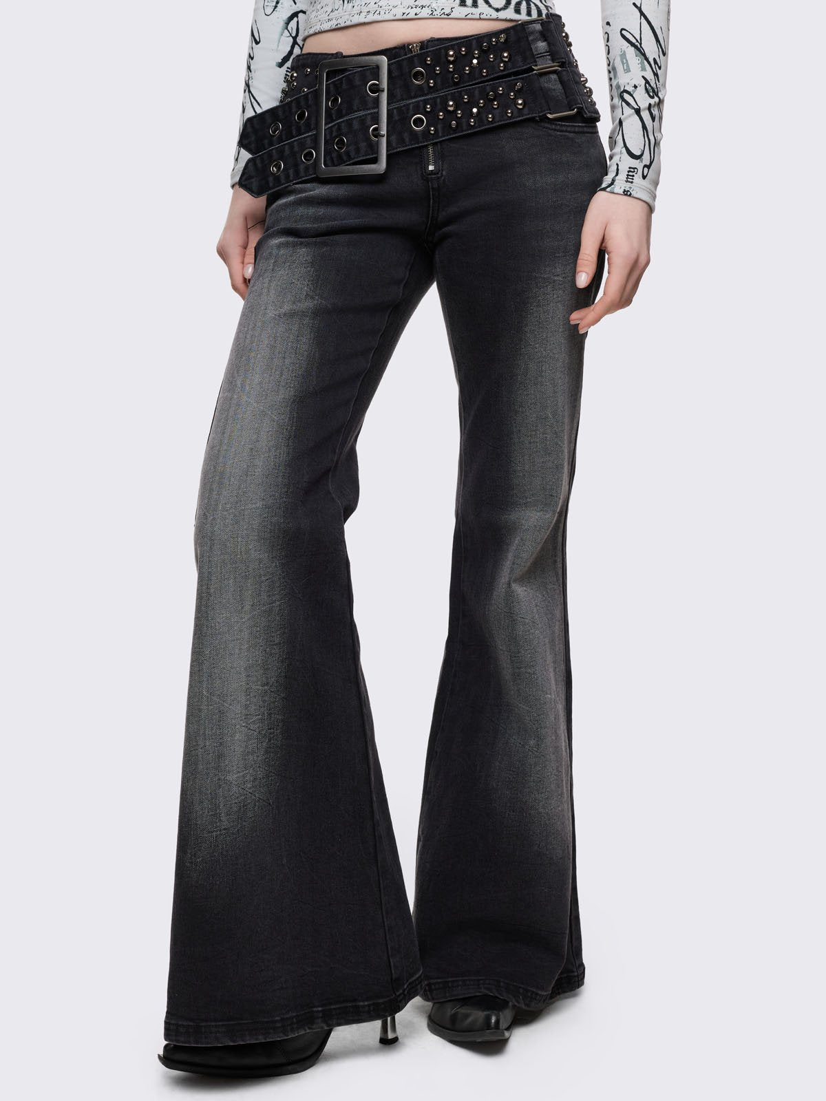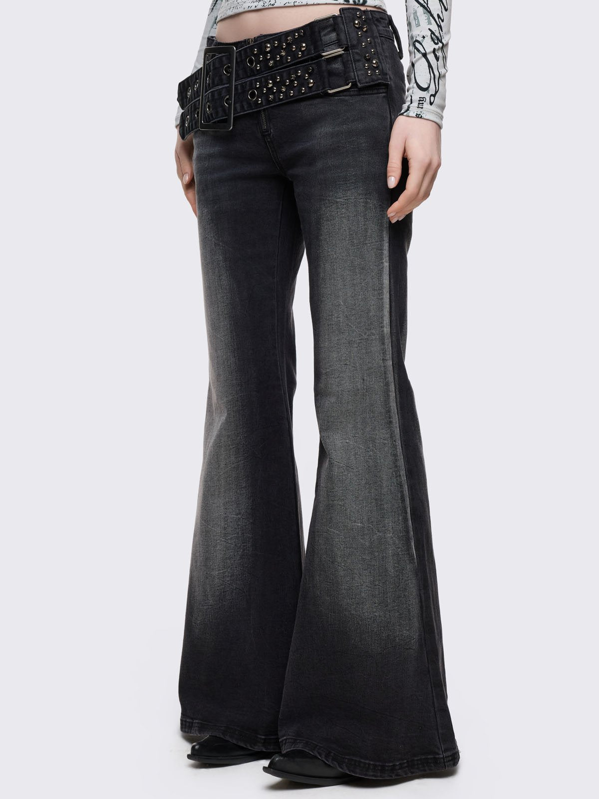 Grey washed flared jeans with double-buckle belt.